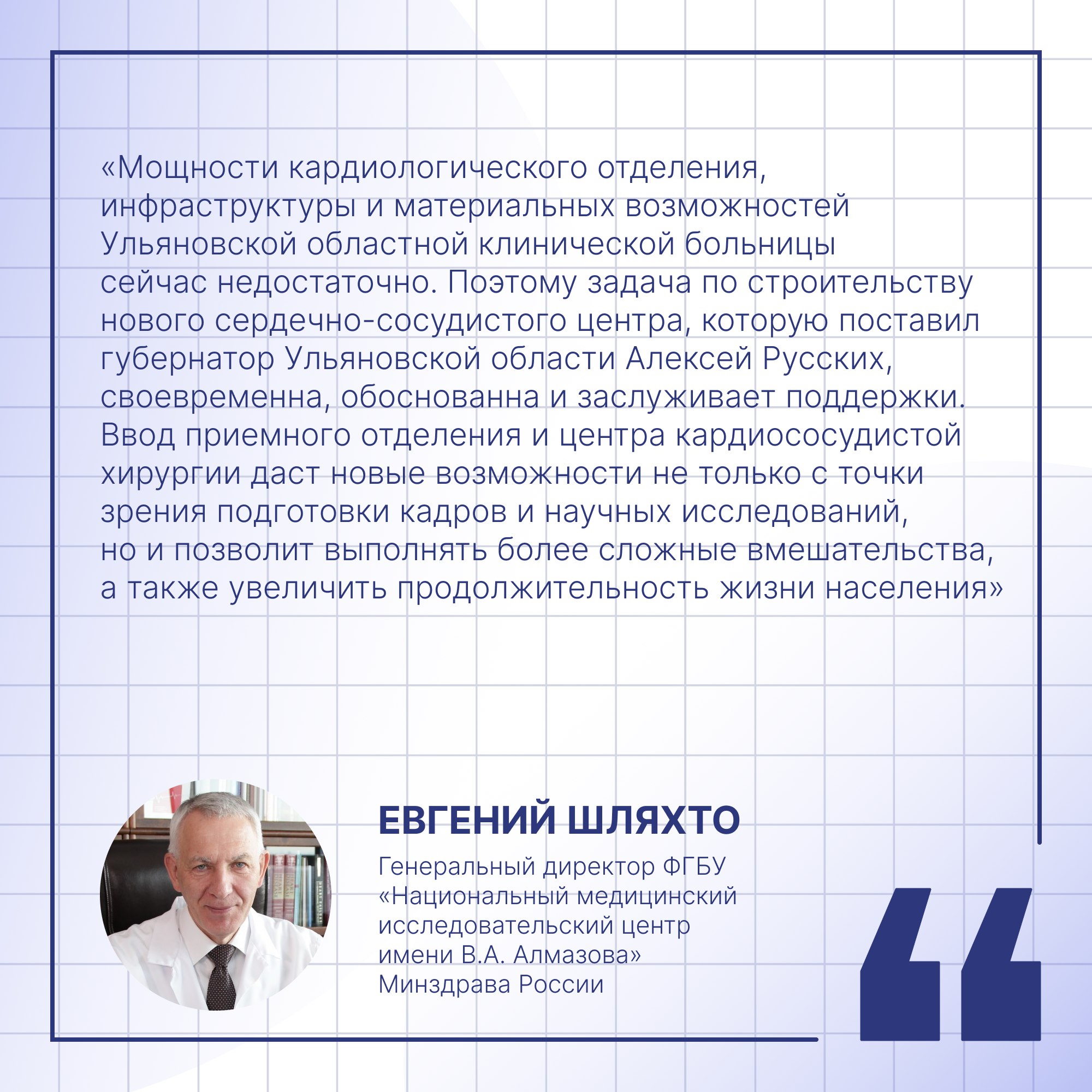 Положительно инициативу губернатора оценили и в профессиональном сообществе. К примеру, генеральный директор ФГБУ «Национальный медицинский исследовательский центр имени В.А. Алмазова» Минздрава России Евгений Шляхто считает, что ввод нового объекта поможет оказывать более качественную медпомощь пациентам с сердечно-сосудистыми заболеваниями