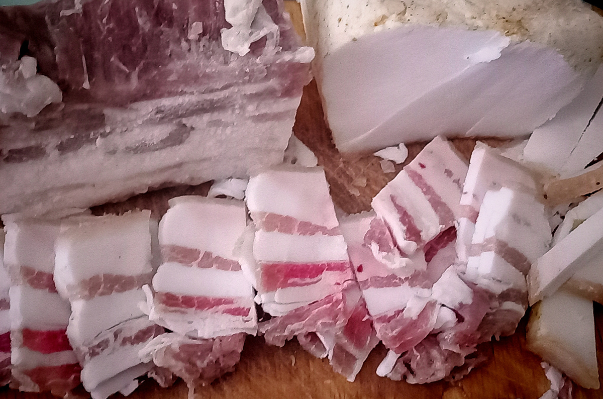 Для начала, сало следует промыть под холодной водой, обсушить и нарезать небольшими кусочками. Затем подготовьте стеклянную банку, куда будет перекладываться нарезанное сало.