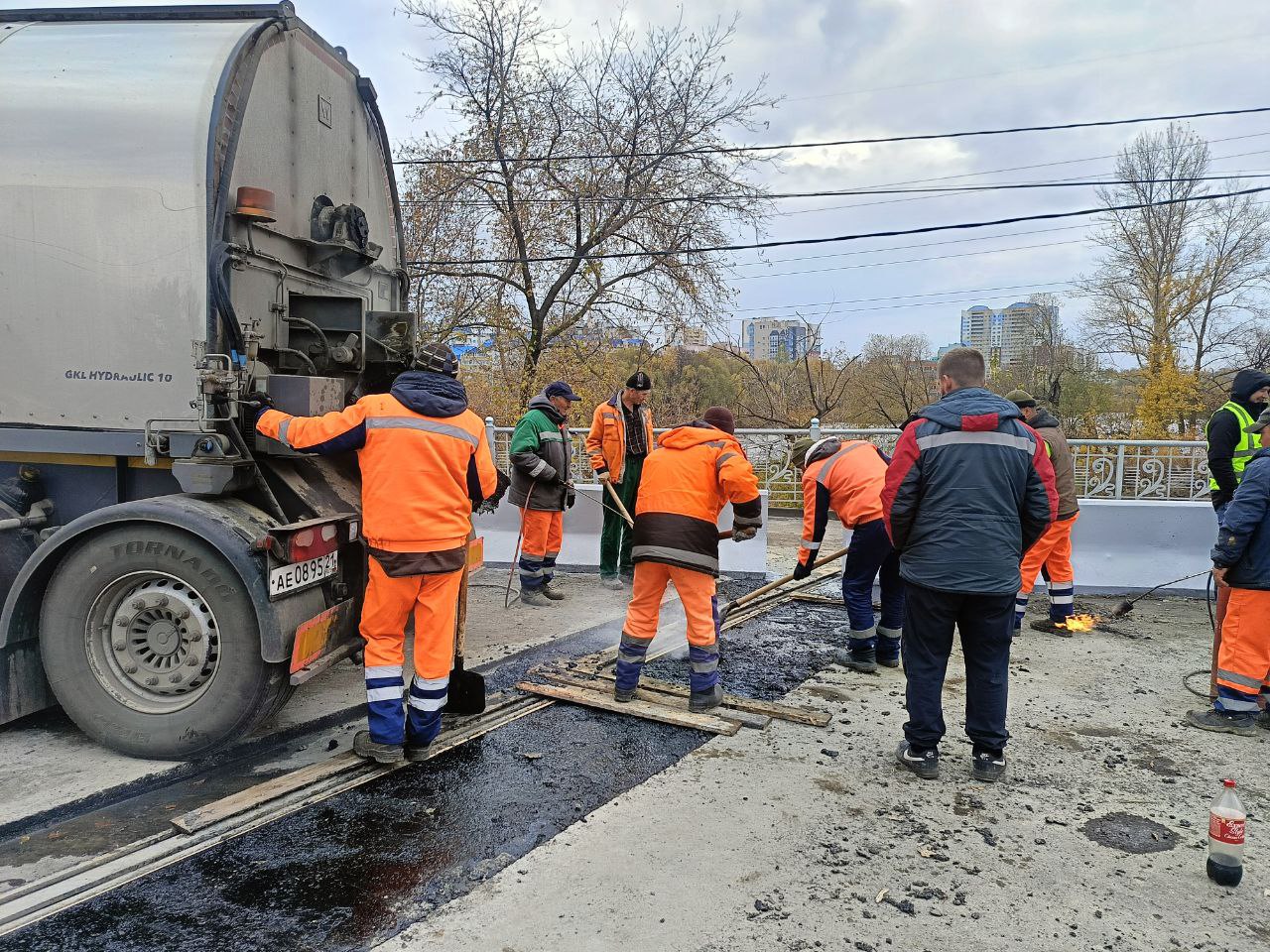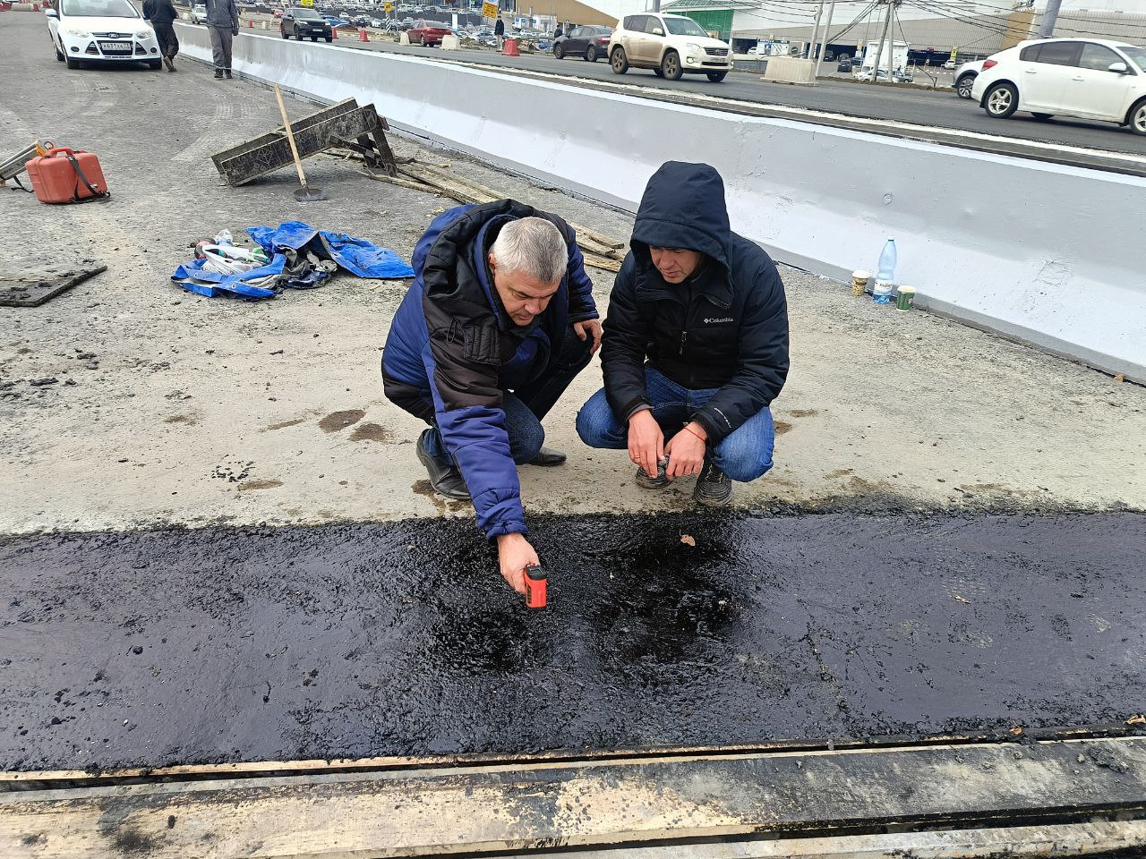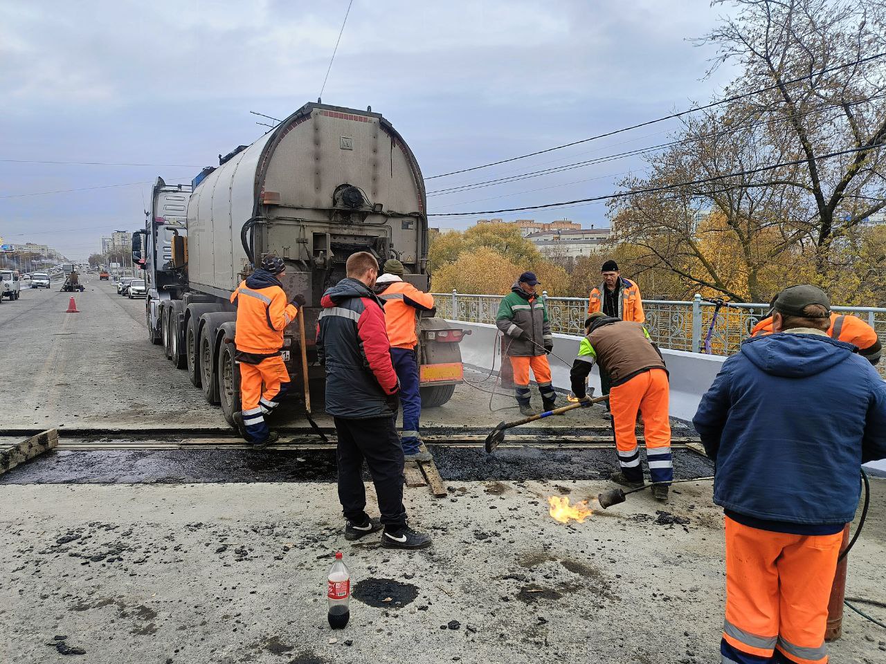 Доставленный в термос-миксере литой асфальтобетон в настоящее время укладывают на примыкании к последнему деформационному шву на русловой части переправы.