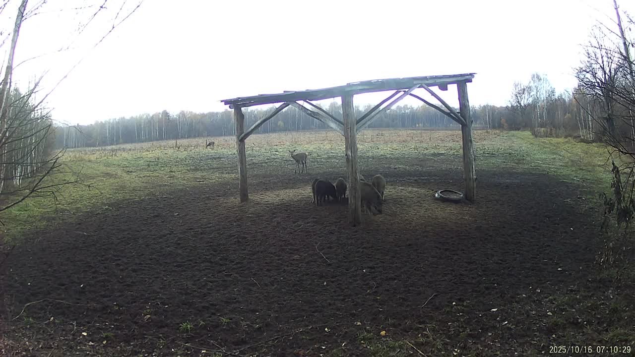 Молодой олененок с любопытством наблюдает за завтраком кабанов