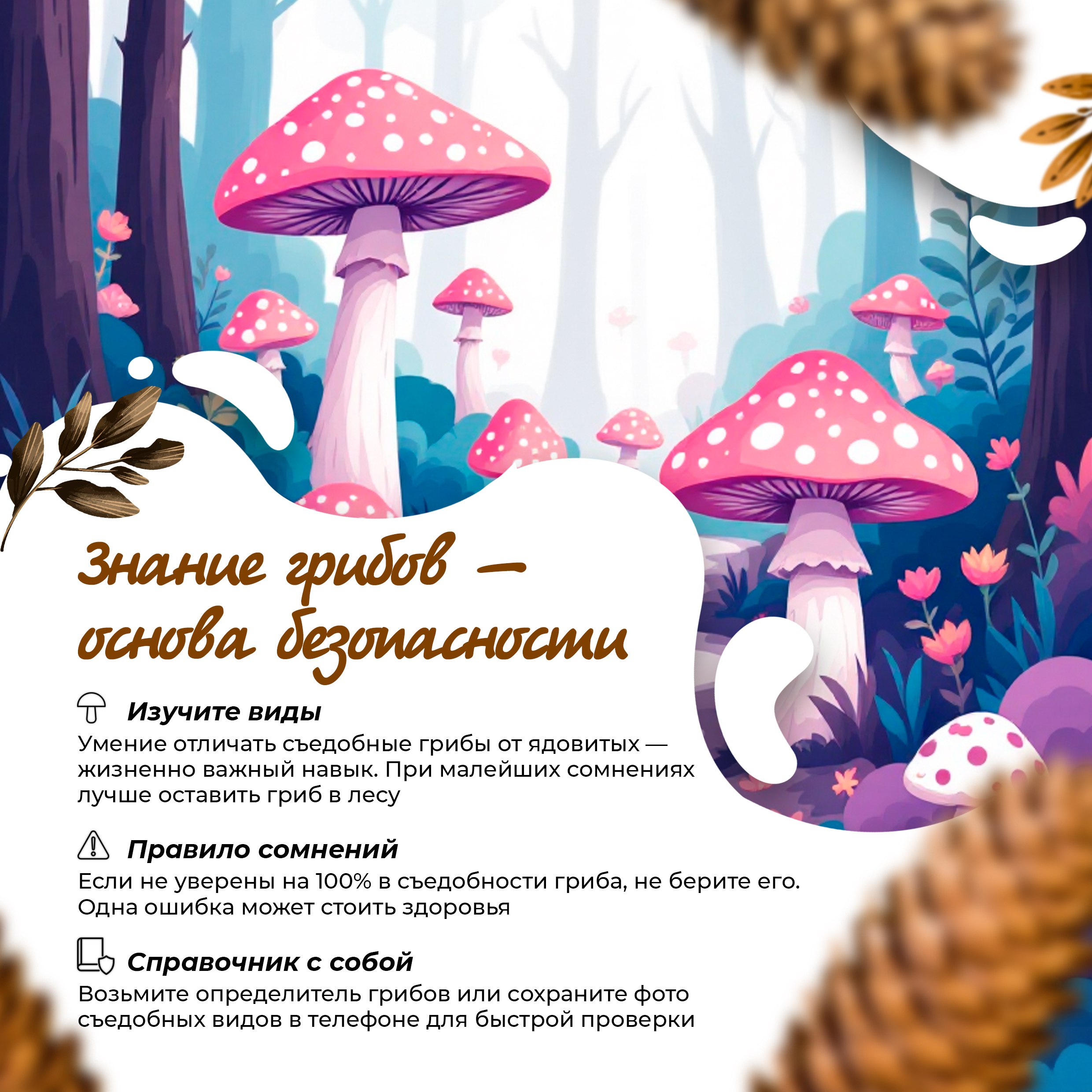 Главное — знать правила, правильно выбирать грибы и иметь подходящую экипировку. Эта памятка поможет вам избежать ошибок и получить максимум удовольствия от сбора грибов