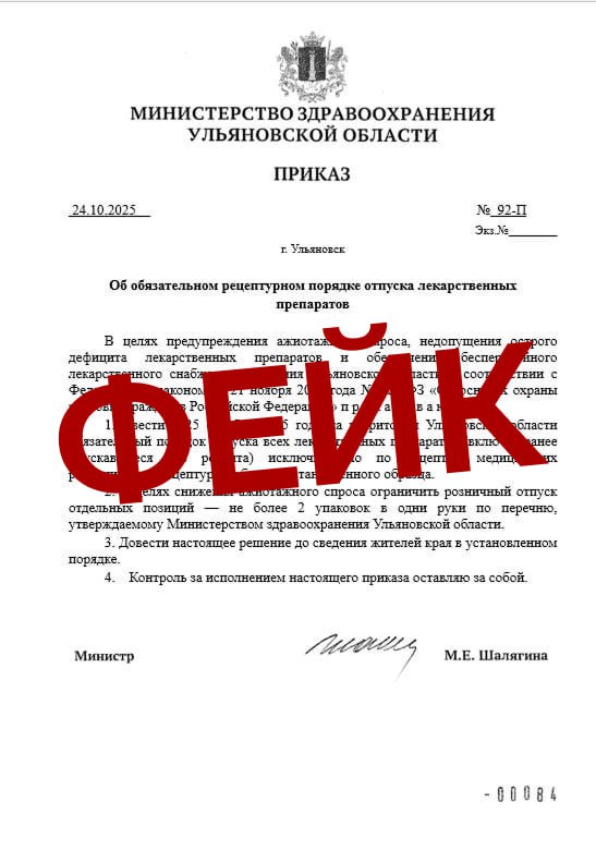 На самом деле повода для беспокойства нет. В Ульяновской области отсутствует дефицит лекарственных препаратов, а документ — очередная подделка от фейкоделов. Фальшивый приказ также выдают формулировки, которые в нормативных правовых документах не используются, и фактологические ошибки.