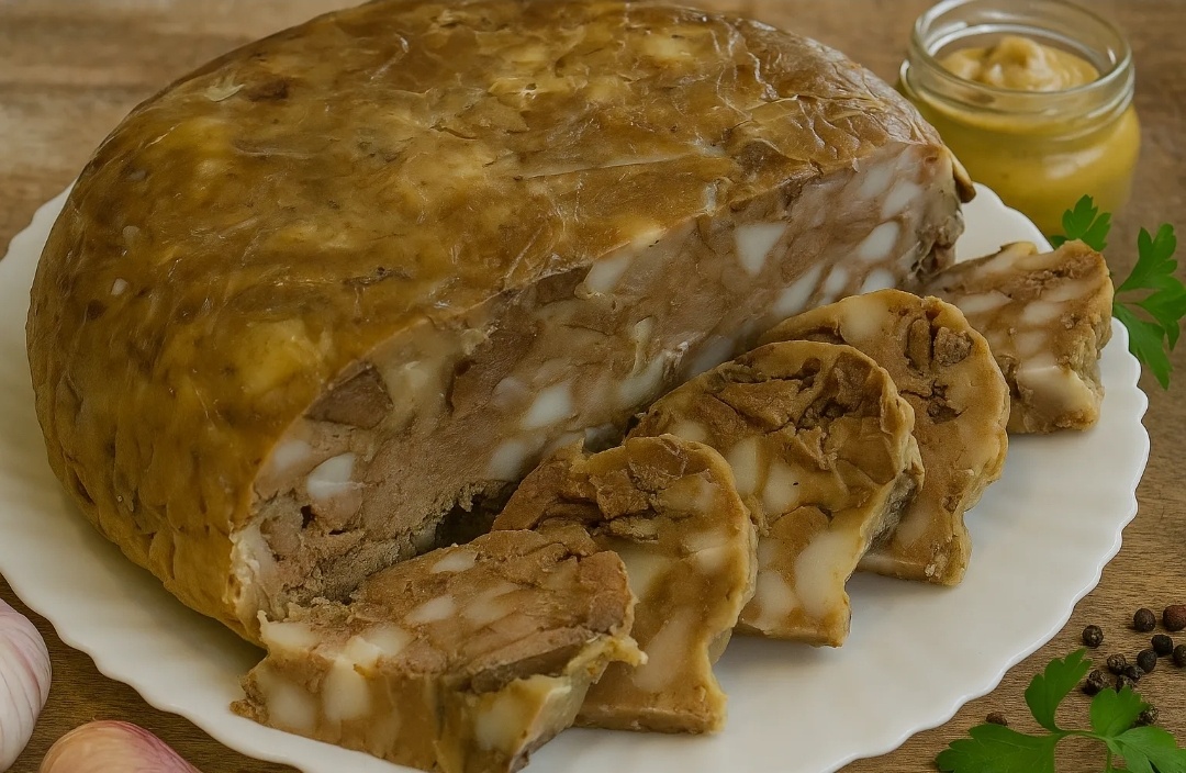 Охлаждение и подача. По завершении варки сальтисон вынимается, охлаждается под прессом и оставляется в холодильнике минимум на 6 часов, а лучше на ночь. Нарезанный кружочками, он идеально подходит как для хлеба, так и в качестве гарнира.