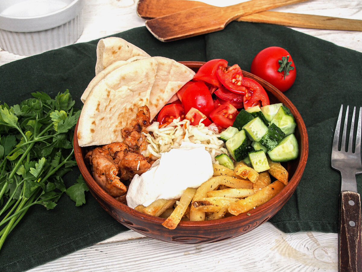 Свежие помидоры и огурцы нарезаются крупными кусочками. Сметана смешивается с тхиной, и по вкусу добавляется соль. Пита слегка поджаривается с обеих сторон.