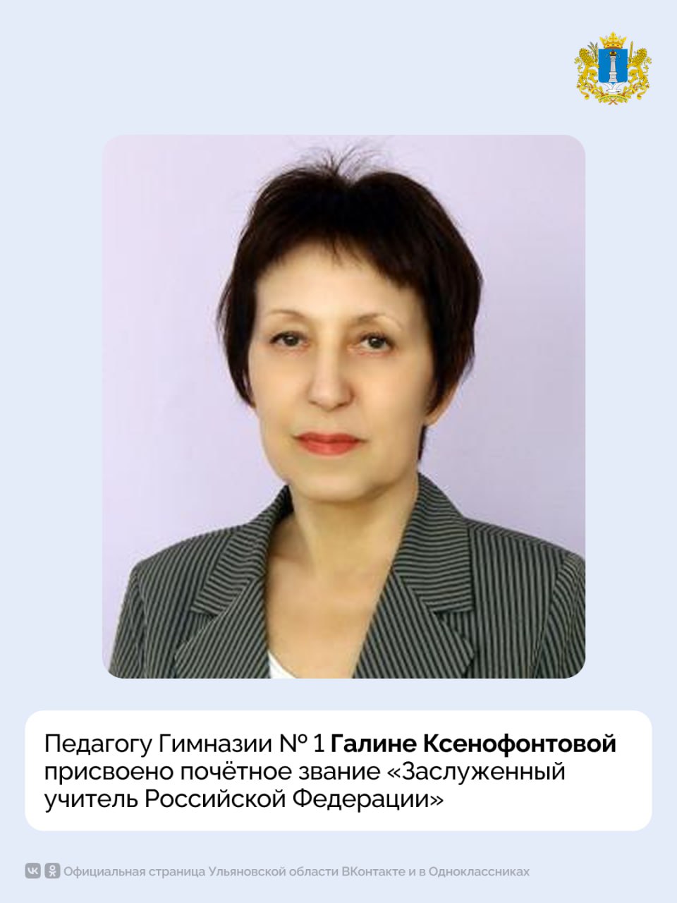 Педагогу Гимназии № 1 имени В. И. Ленина Галине Ксенофонтовой присвоено почётное звание «Заслуженный учитель Российской Федерации»