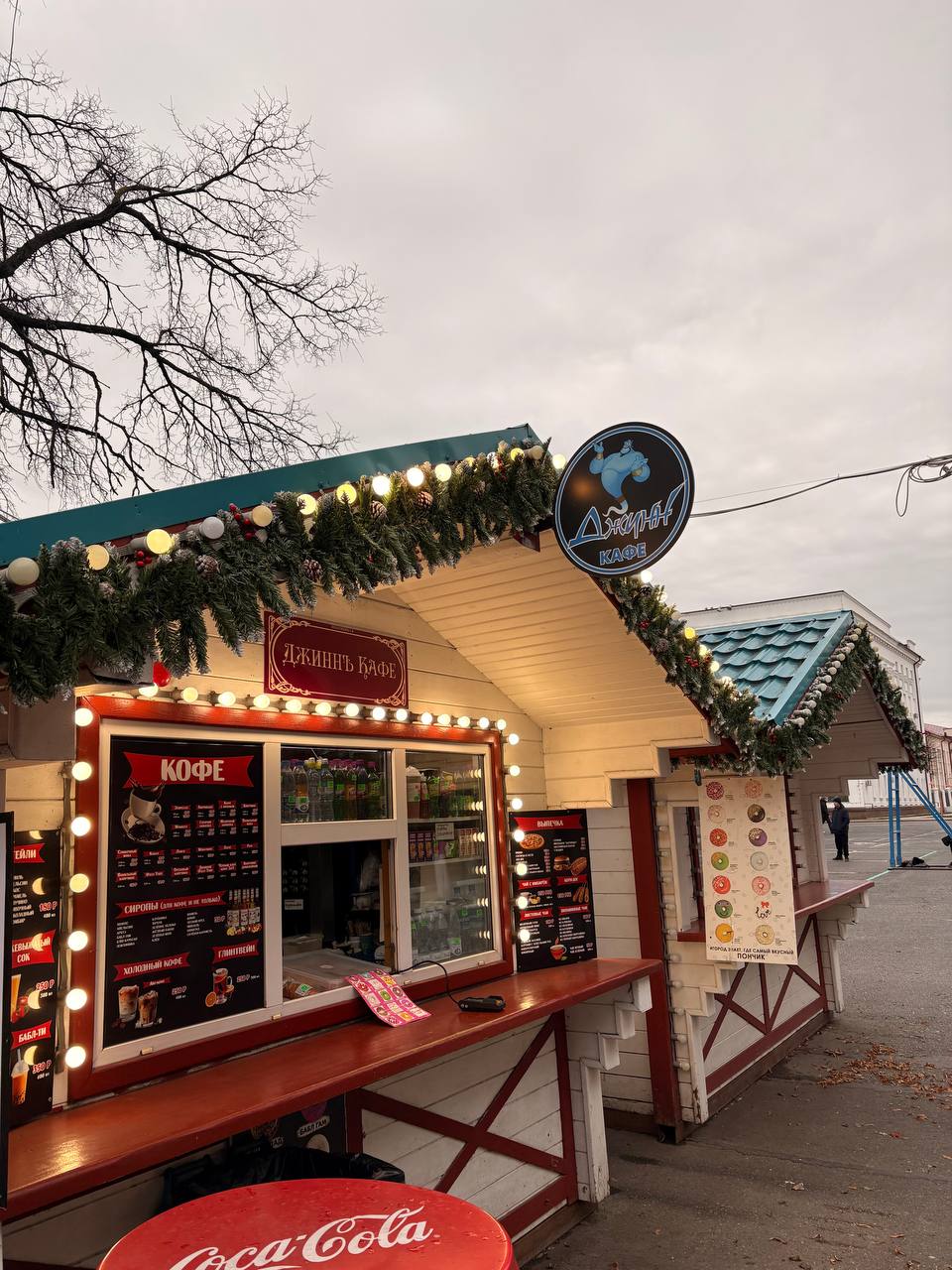 Троицкий переулок уже нарядили: огни, декор, предпраздничное настроение — всё на месте. Здесь уже стоит ёлочка — осталось только подключить гирлянды, и она засияет понастоящему позимнему.