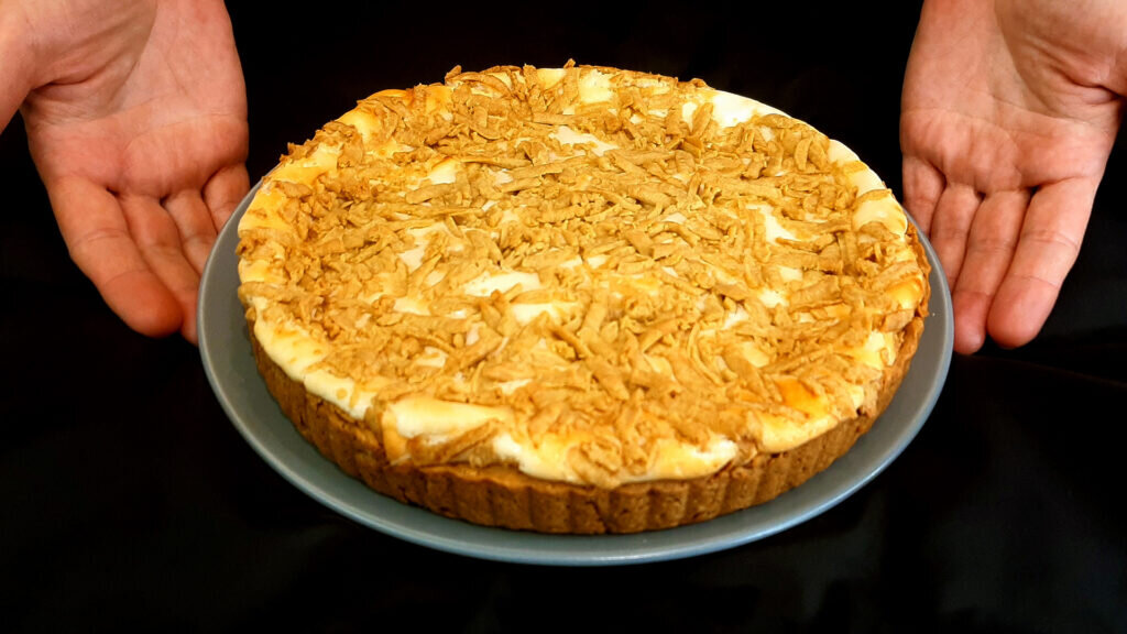 Для начинки белки взбиваются до устойчивых пиков, затем по чайной ложке добавляется сахар, продолжая взбивание. После этого, осторожно перемешивая, вводится сметана и крахмал. Получившуюся массу аккуратно выливают в подготовленное тесто и засыпают тертыми обрезками теста сверху.