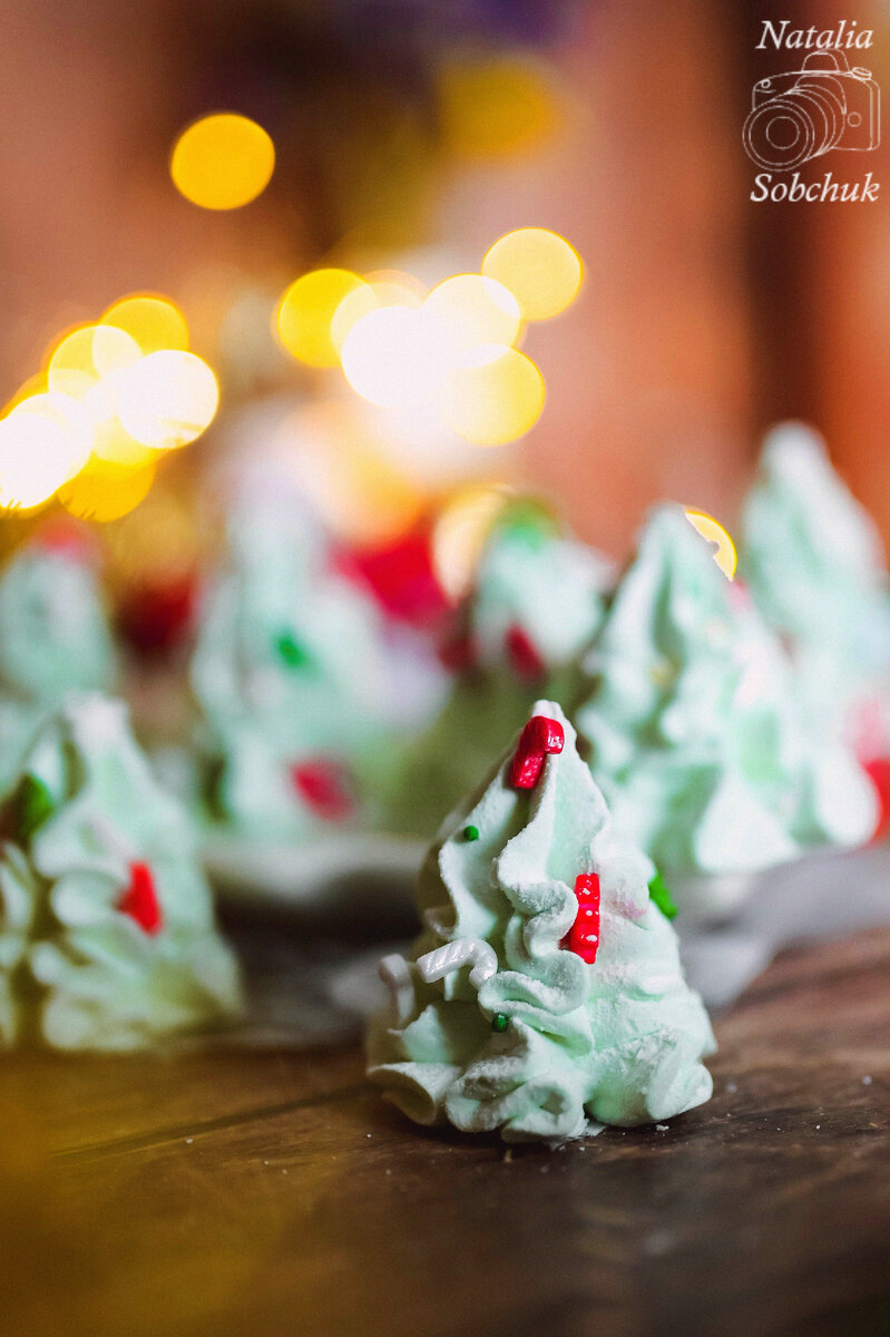 Зефирную массу переливают в кондитерский мешок с насадкой и отсаживают на подготовленный противень в форме ёлочек. После украшения сладкие ёлочки оставляют стабилизироваться на ночь, а затем посыпают сахарной пудрой для завершения образа.