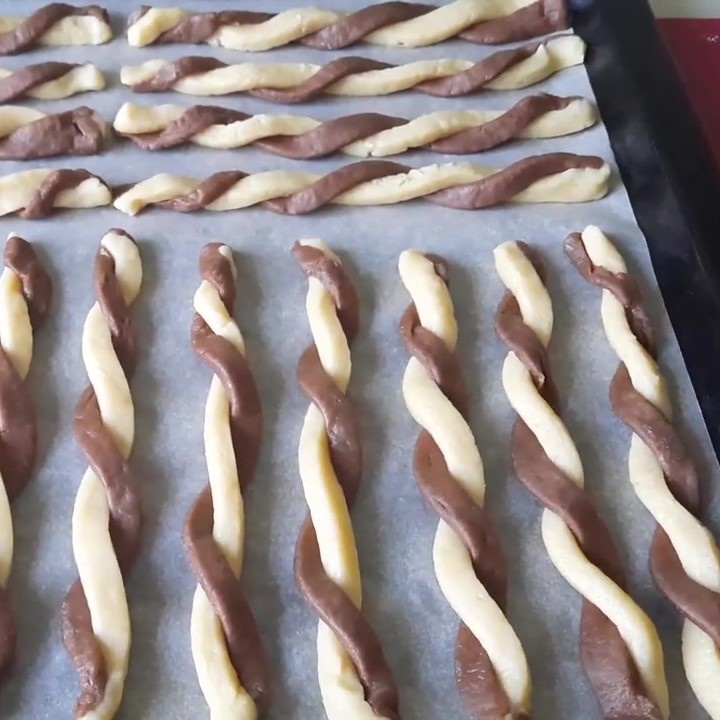 Приготовление: Смешайте все ингредиенты, кроме какао и 2 столовых ложек муки. Разделите тесто на две части: в одну добавьте муку, в другую — какао. Охладите каждую часть теста, затем раскатайте и нарежьте на полоски. Выпекайте при температуре 200°C в течение 10 минут.
