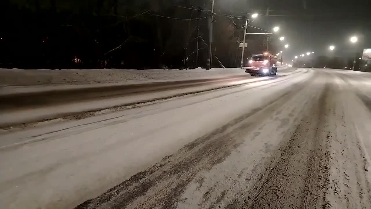 Противогололёдными материалами обработали Димитровградское шоссе и другие крупные магистрали. Всего за ночь рабочие использовали порядка 96 тонн пескосоляной смеси и 8 тонн реагента