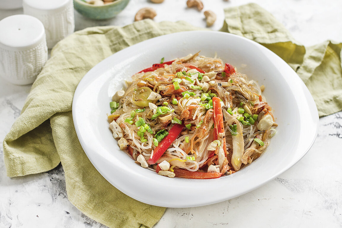 Рецепт стеклянной лапши с вёшенками и овощами в азиатском соусе