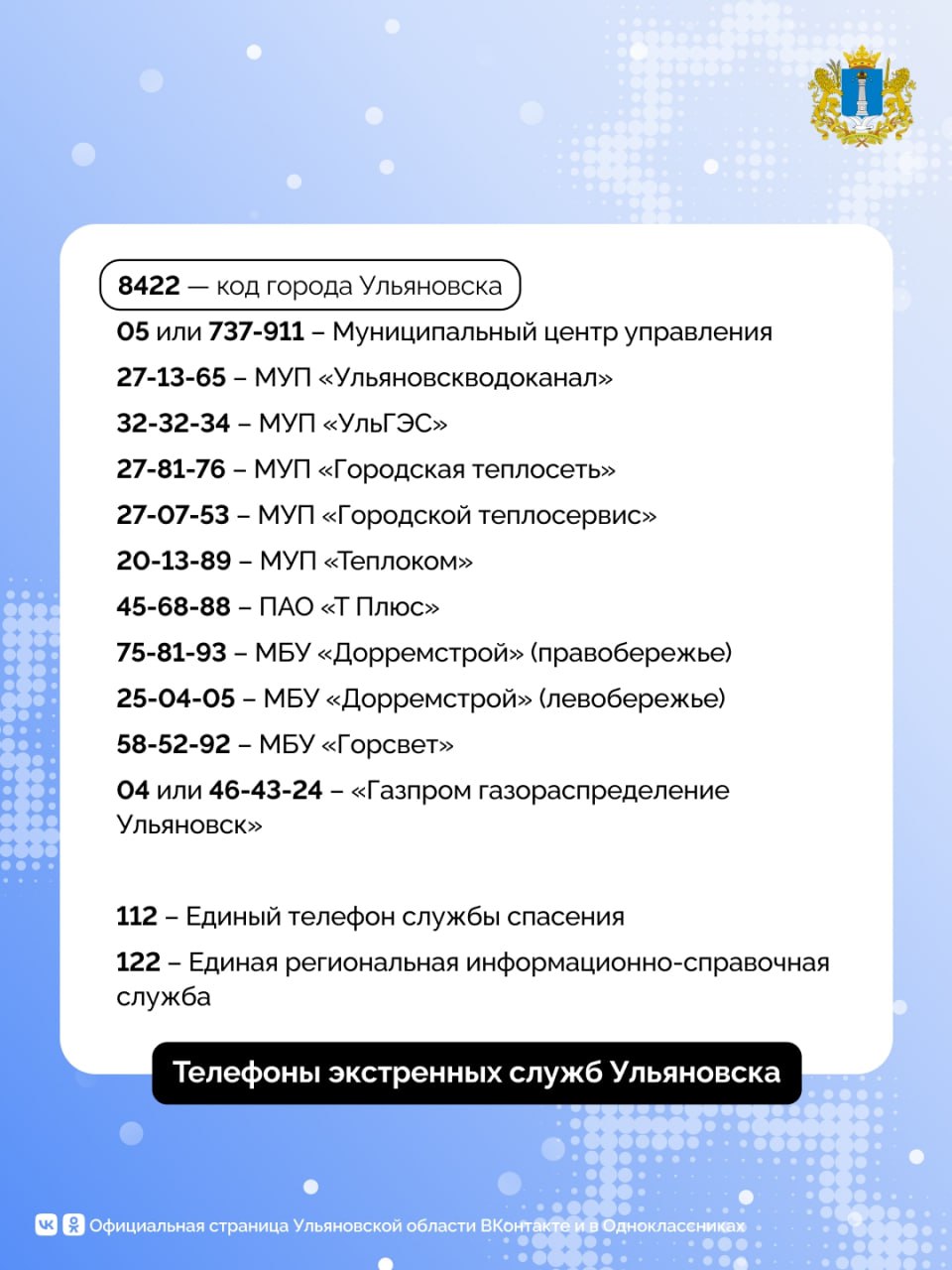 Телефоны аварийно-диспетчерских служб Ульяновска, куда при необходимости можно обратиться при возникновении нештатных ситуаций.
