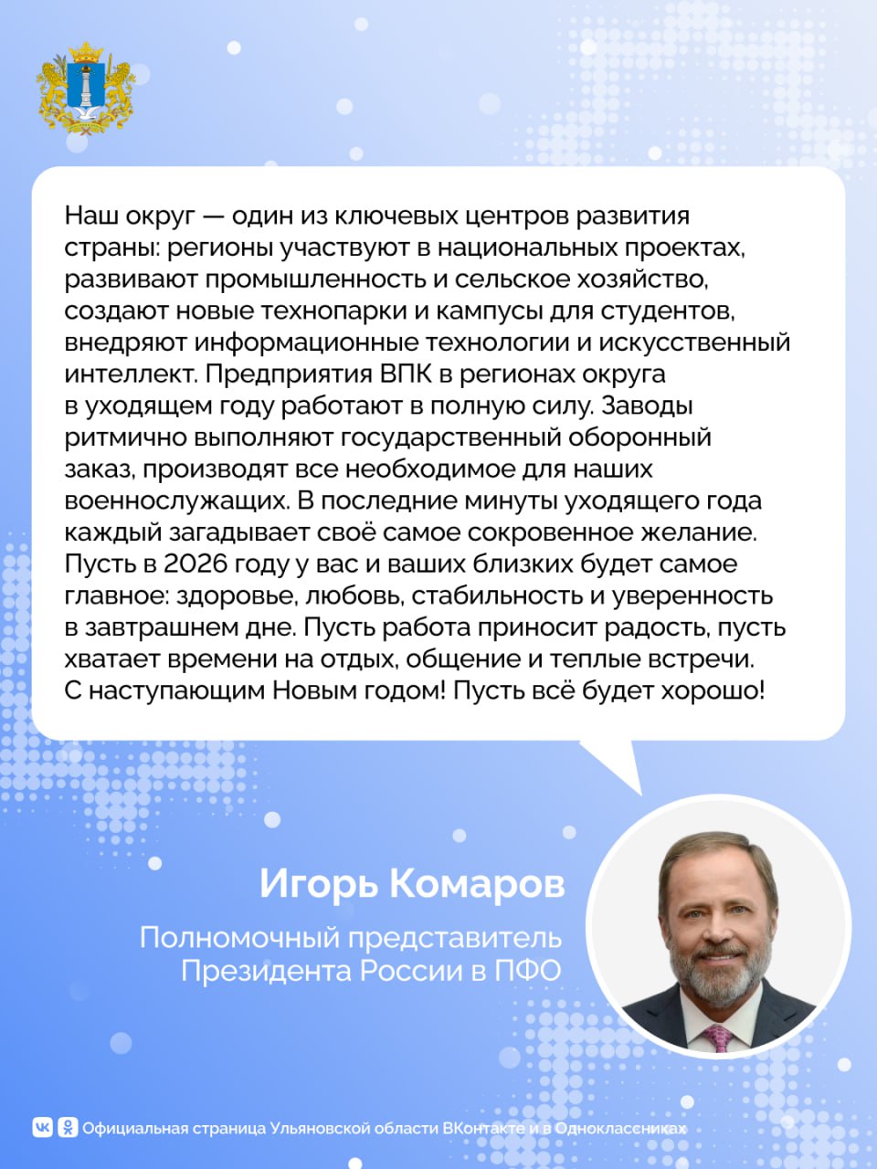 Уважаемые жители Ульяновской области!Дорогие коллеги и друзья!Приближается время самых добрых и светлых праздников – Нового 2026 года и Рождества Христова. От всей души поздравляю вас с этими прекрасными днями, которые дарят нам надежду...