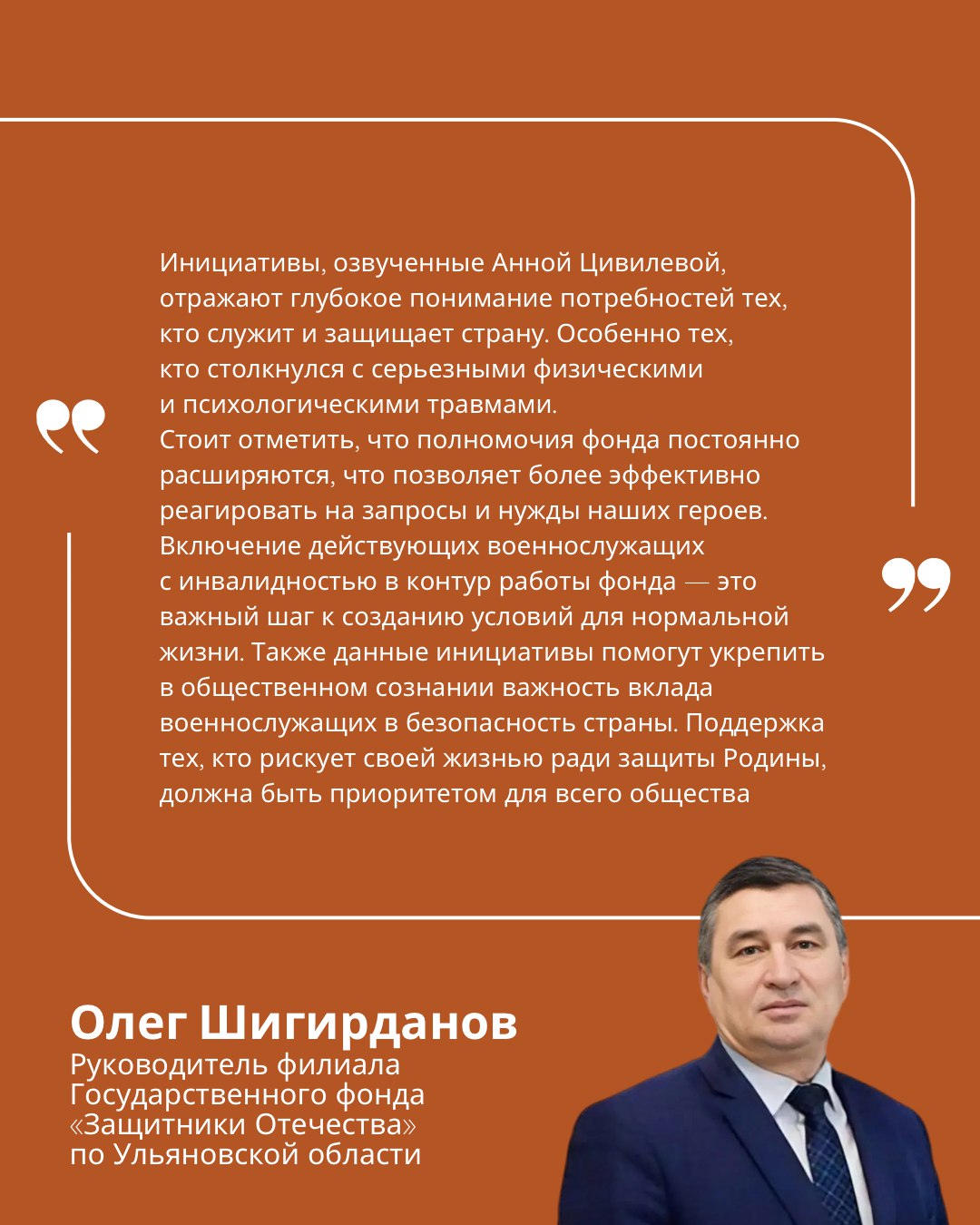 Теперь организация сможет помогать и действующим военнослужащим с инвалидностью, которые после возвращения из зоны СВО остались служить в армии. Такое решение глава государства принял после рабочей встречи со статс-секретарем – заместителем Министра обороны РФ, председателем Государственного фонда «Защитники Отечества» Анной Цивилевой. Ранее полномочия фонда распространялись лишь на участников спецоперации, которые уволены с военной службы.