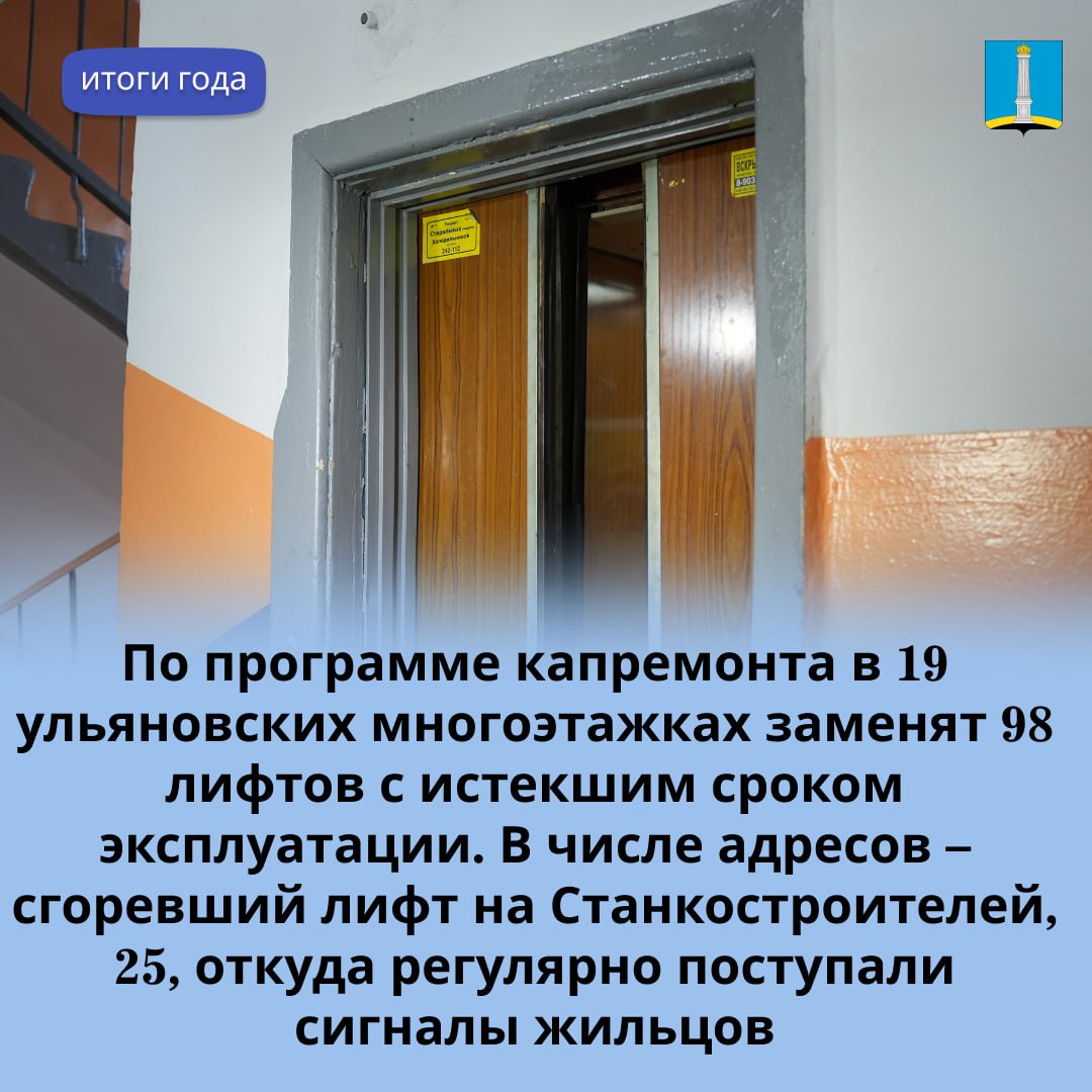 Особое внимание – замене старых и изношенных лифтов. В 2026 году планируется поменять лифтовое оборудование в 19 ульяновских многоэтажках, это – 98 лифтов с истекшим сроком эксплуатации. В их числе – сгоревший лифт на Станкостроителей, 25, откуда регулярно поступали сигналы жильцов.