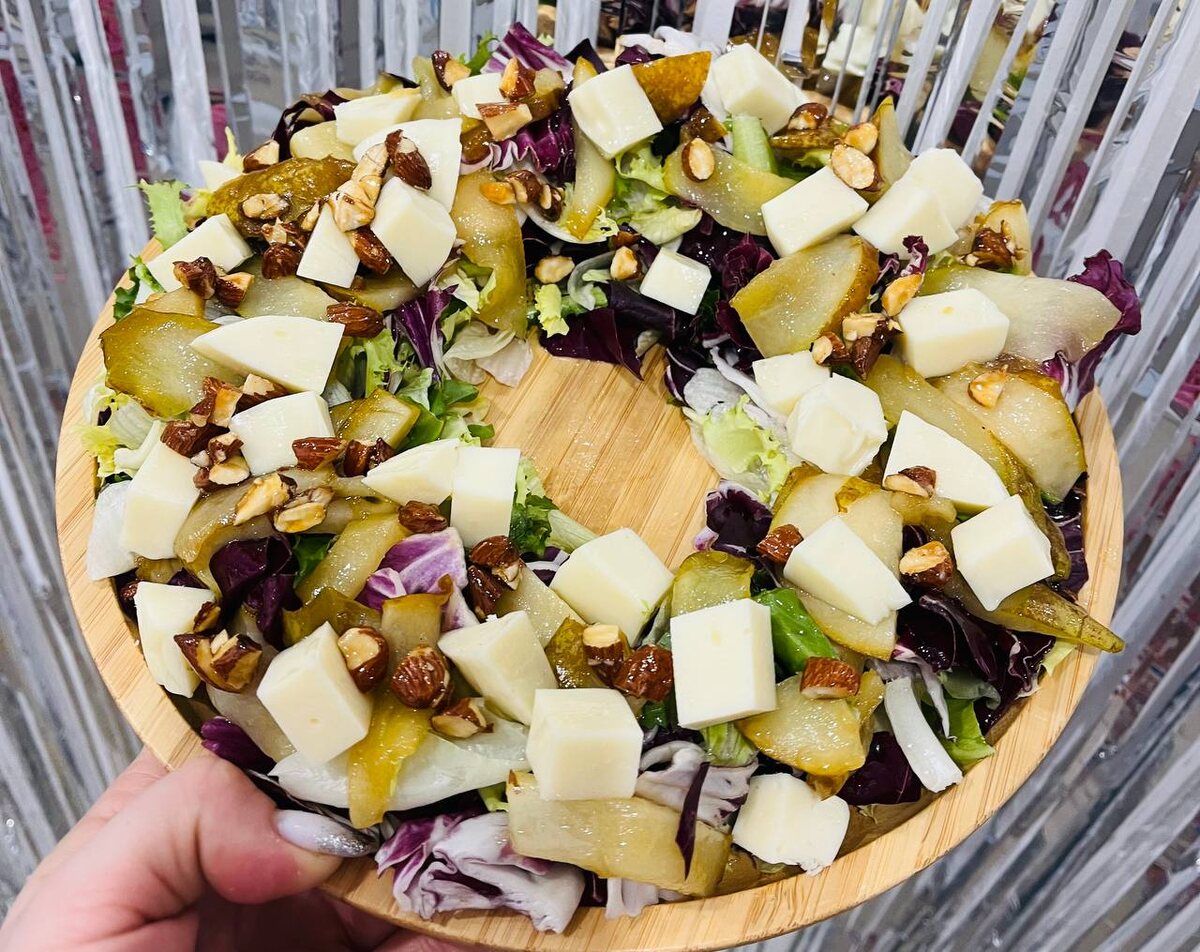Следующий салат, названный "Венок", понравится тем, кто любит сочетания сочных фруктов и сыра. Сначала груши обжариваются в сливочном масле с добавлением сахара. После этого на сервировочную тарелку выкладывается микс из салатов, а сверху - кусочки груши и нежный сыр с голубой плесенью. Для придания изысканности добавьте орехи (грецкие или миндаль) и полейте заправкой из оливкового масла, лимонного сока и меда. Это довольно легкое и эффектное блюдо, которое идеально подойдет для праздничного ужина.