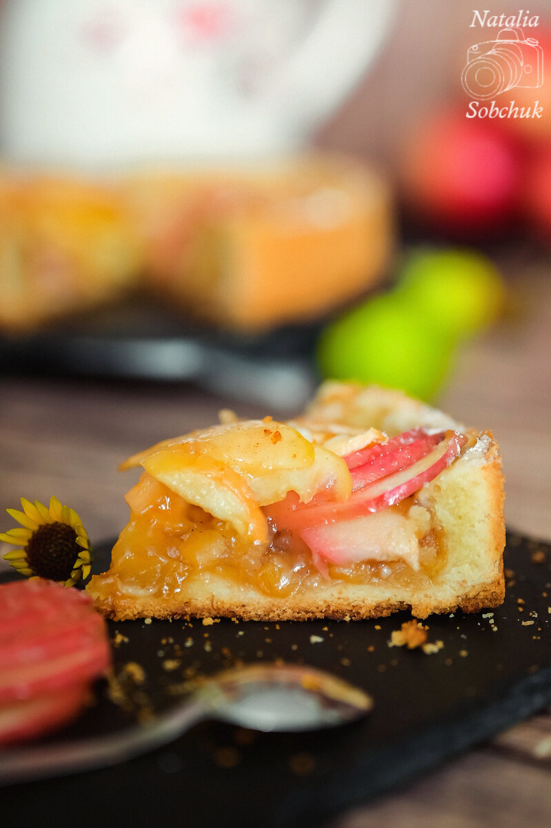 Теперь осталось собрать тарт. Раскатайте охлажденное тесто и аккуратно перенесите его в форму. Выложите тушеные яблоки на дно и украсьте свежими слайсами яблок разного цвета, посыпьте сахаром и кукурузным крахмалом. Выпекайте тарт в заранее разогретой до 180° округлой форме около часа.
