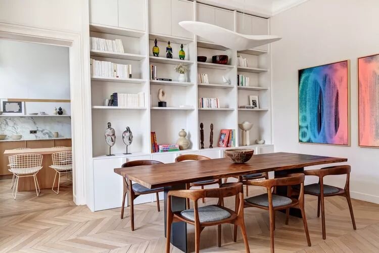 - Столовая-библиотека: Установите полки с книгами, которые придадут комнате интеллигентный вид. Ввиньте старинные предметы — это добавит шарм.