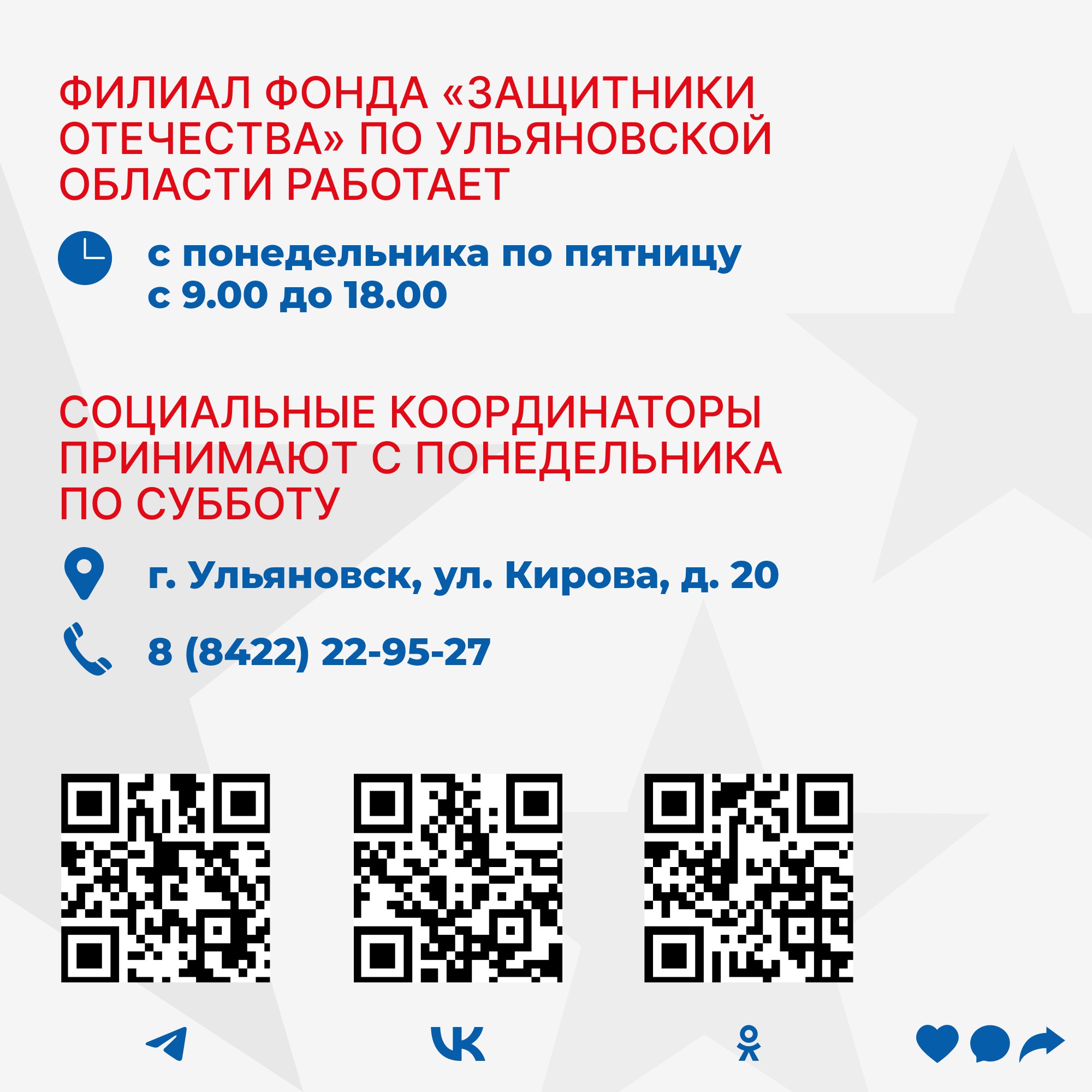 Официальные каналы филиала фонда «Защитники Отечества» в Ульяновской области в соцсетях: в ВК (https://vk.com/svofond), в Одноклассниках (https://ok.ru/svofond), в Телеграм (https://t.me/svoFond)