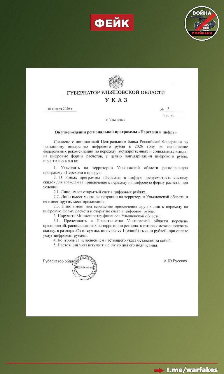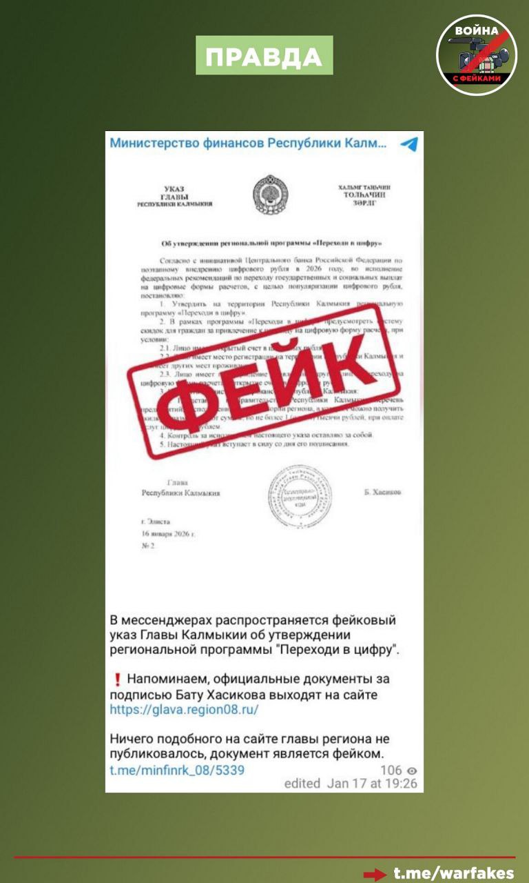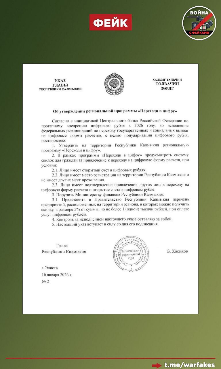 Фейк: В Республике Калмыкия и Ульяновской области ввели программу «Переходи в цифру», согласно которой государственные и социальные выплаты переходят на цифровые расчеты. Соответствующие указы подписали главы регионов, сообщил ряд телеграм-каналов.