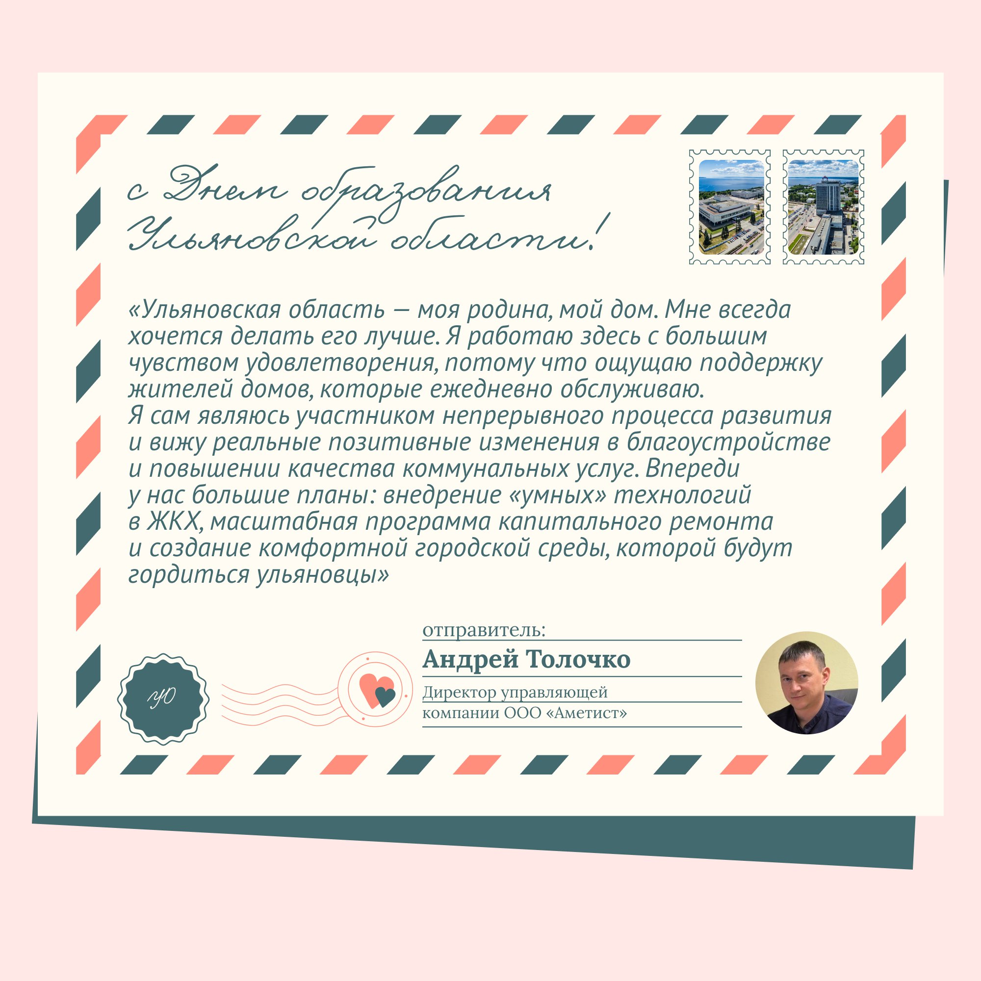 Директор управляющей компании ООО «Аметист» Андрей Толочко поздравил жителей региона с Днем образования Ульяновской области и рассказал о перспективах развития сферы ЖКХ.