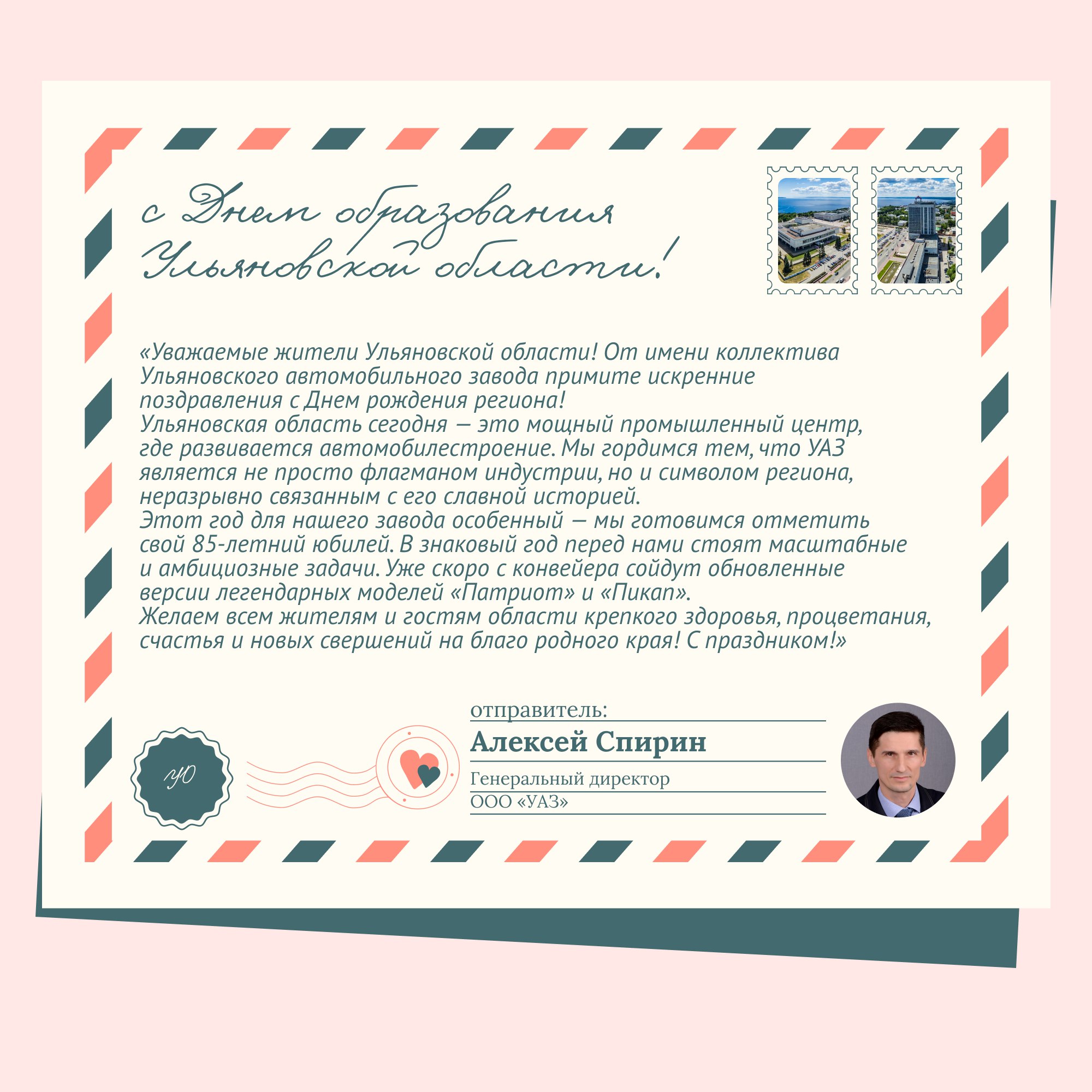 Генеральный директор ООО «УАЗ» Алексей Спирин поздравил жителей Ульяновской области с Днем рождения региона.