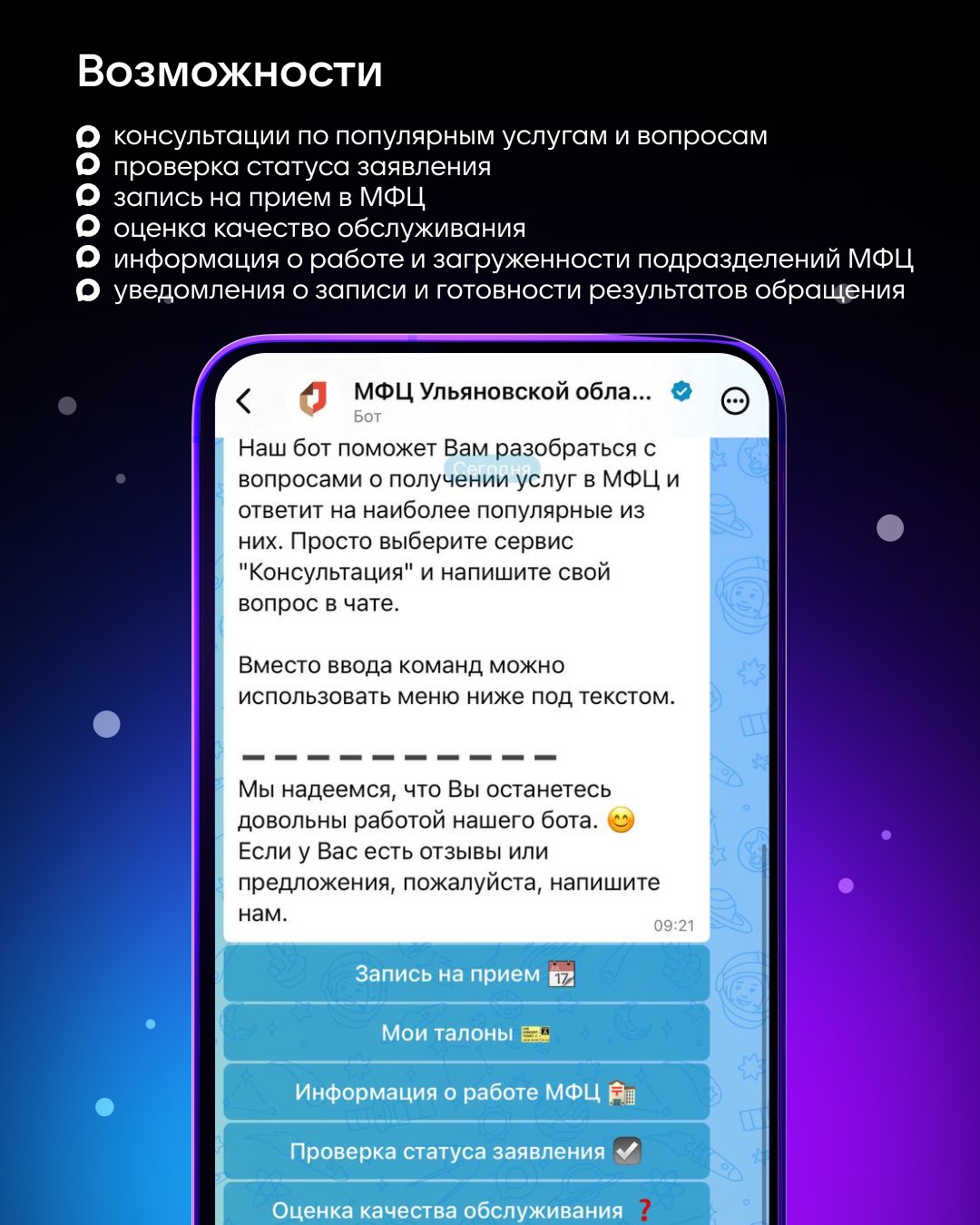 Запись на прием, проверка статуса заявления, уведомления о готовности документов и даже информация о загруженности отделений — все это доступно в одном чате 24/7.
