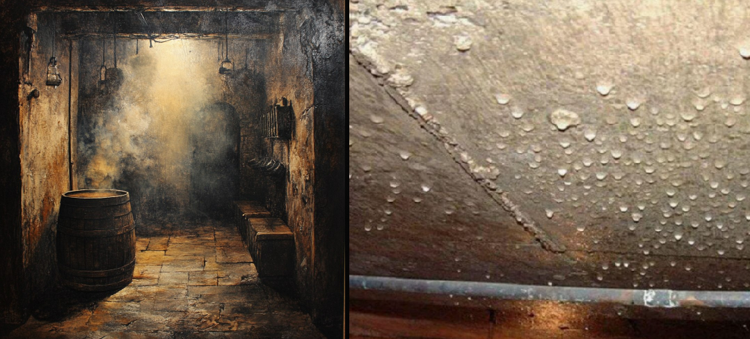 Конденсат образуется, когда температура потолка ниже температуры воздуха в погребе. Влага, исходящая от хранящихся продуктов, испаряется и оседает в виде капель на поверхности. Это приводит к плесени, вредящей как запасам, так и материалам стен и потолка. Скучивание влаги может также возникать вследствие отсутствия хорошей вентиляции или грамотной гидроизоляции.