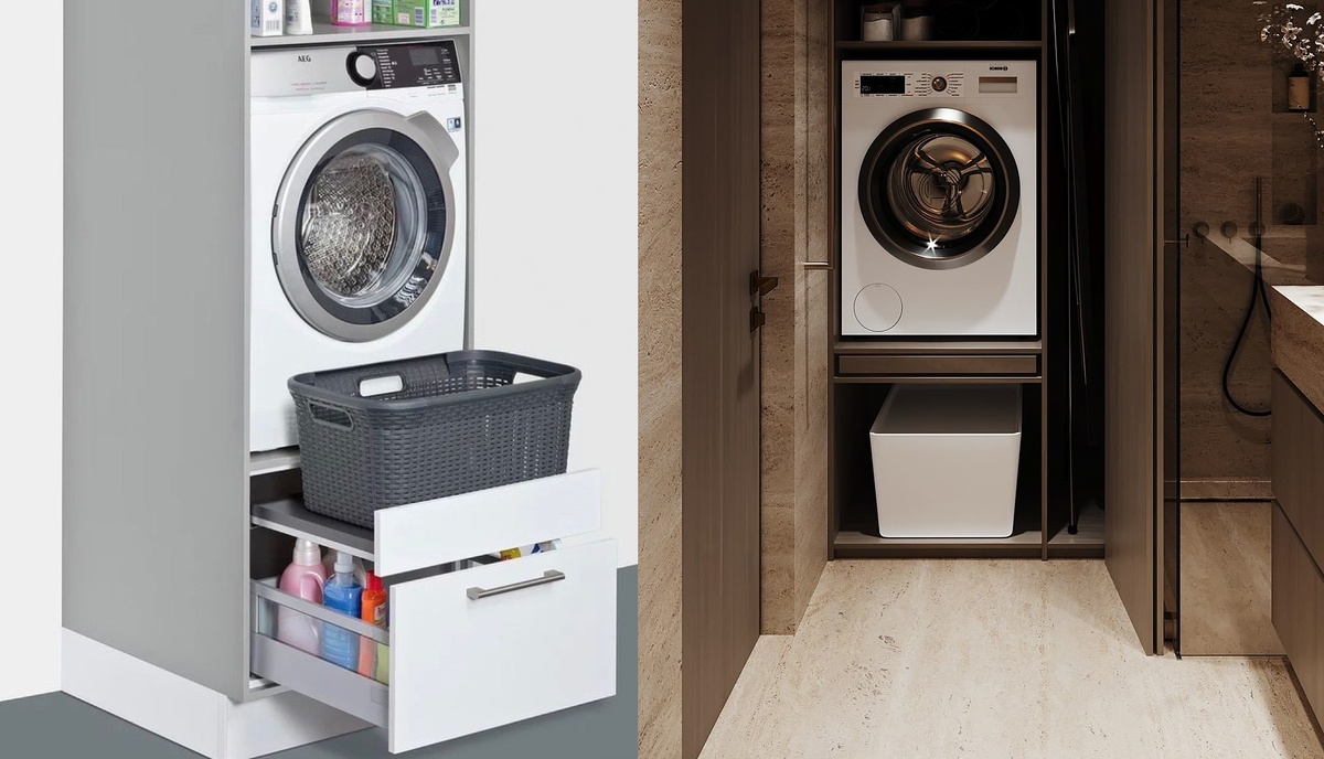 Под машинкой появляется новая высота и порядок: дверца на уровне груди, корзина для грязного белья и место под порошки в одном удобном наборе. Маленькая деталь — большая экономия движений, которые раньше занимали время и вызывали неудобство.