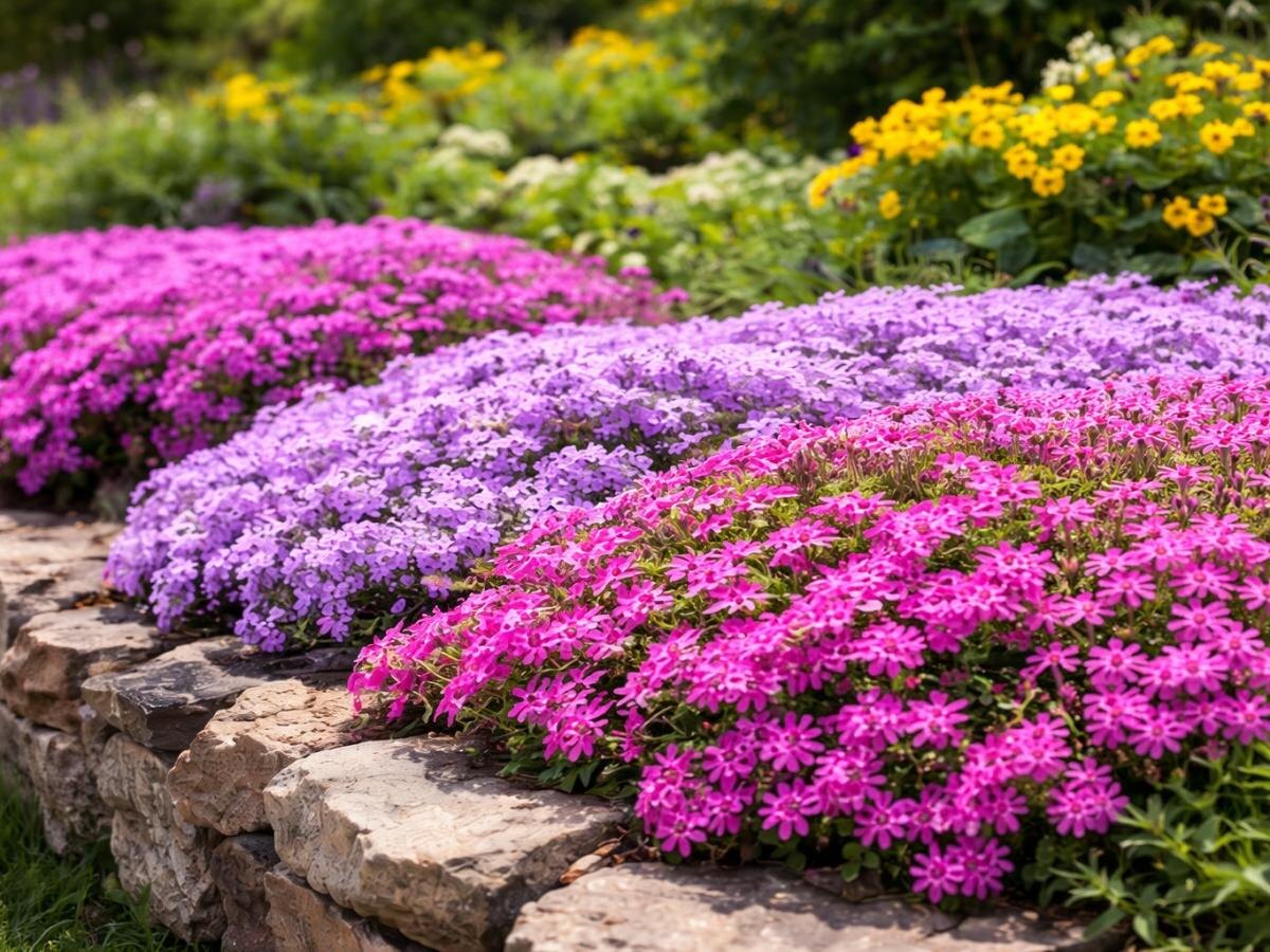 Выбирайте по освещённости и типу почвы. Для солнечных дорожек подойдут очиток и тимьян, вдоль камней хорошо смотрятся котовник и вероника, а для склонов — иберис и флокс шиловидный. Чтобы ковёр был ровным, регулярно стригите после цветения и не забывайте про дренаж.