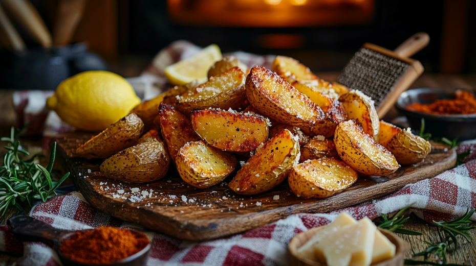 Небольшие дольки картофеля, поласканные маслом и специями, отправляются в духовку. Время запекания — около получаса, до появления аппетитной корочки. За несколько минут до готовности посыпаем пармезаном, чтобы он расплавился и образовал хрустящую шапку.