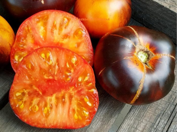 На огороде вдруг появляется нечто особенное: ярко-оранжевые плоды с фиолетово-синими плечами притягивают взгляд и вызывают желание узнать, как они устроены внутри привычной палитры томатов.