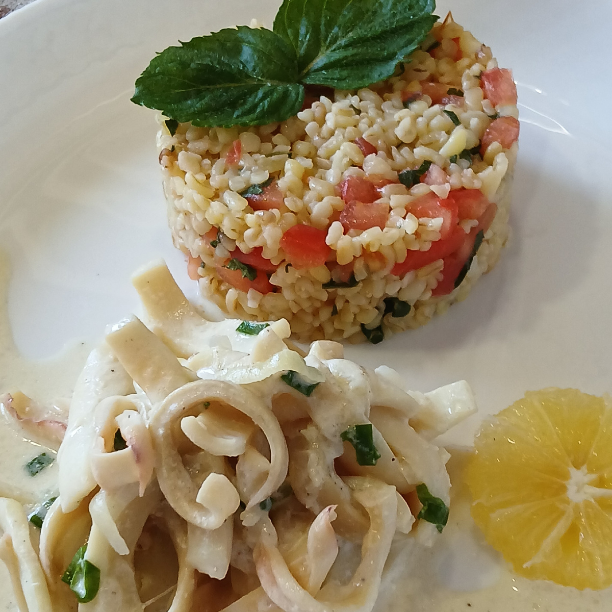 Суть — кальмар в нежном сливочном соусе, рядом — ароматный булгур с мятой и томатами. Такой дуэт дарит свежесть и легкую элегантность ужина без лишних хлопот.