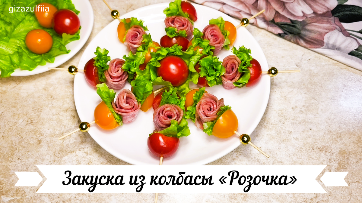 Чтобы создать одну розочку, потребуется выложить три кружочка колбасы в ряд, слегка перекрывая их друг другом. Затем этот ряд стоит аккуратно сложить пополам и свернуть в форме рулета, чтобы в результате получилась изящная розочка. Далее, на шпажку аккуратно насаживаются ингредиенты в следующем порядке: половинка помидора черри, лист салата, готовая колбасная розочка, снова листик салата и, завершая, вторая половинка помидора черри.
