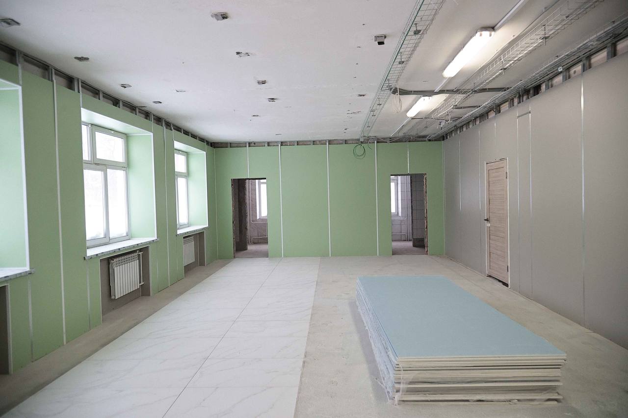 Полным ходом идет капремонт в школе 49. Здесь учатся 600 ребят. Здание 60-х годов постройки. Активно ведутся внутренние работы: перепланировка пищеблока, обновление инженерных сетей, ремонт 1 этажа. Также закупим оборудование для учёбы: компьютеры, интерактивные доски, лаборатории.