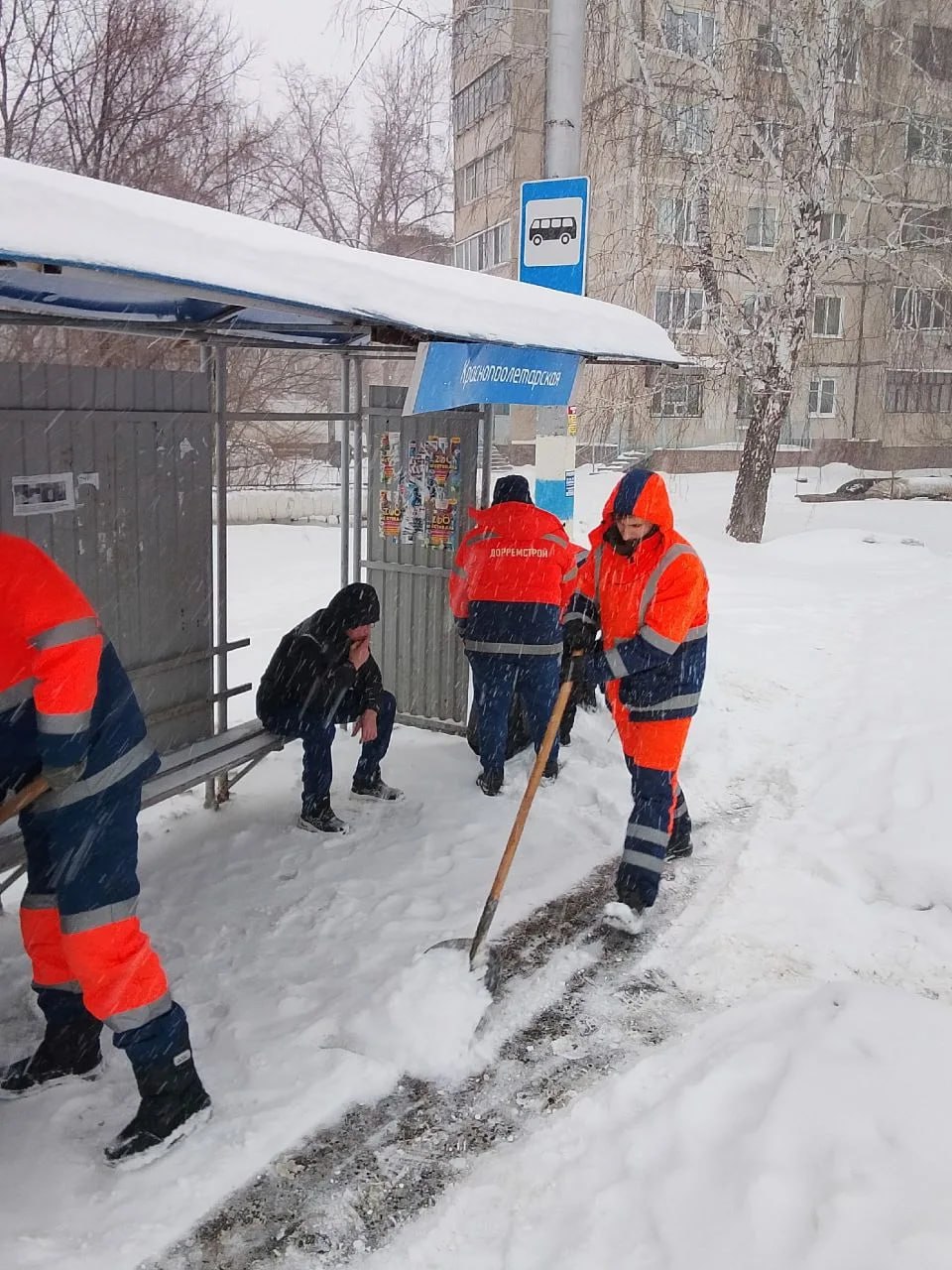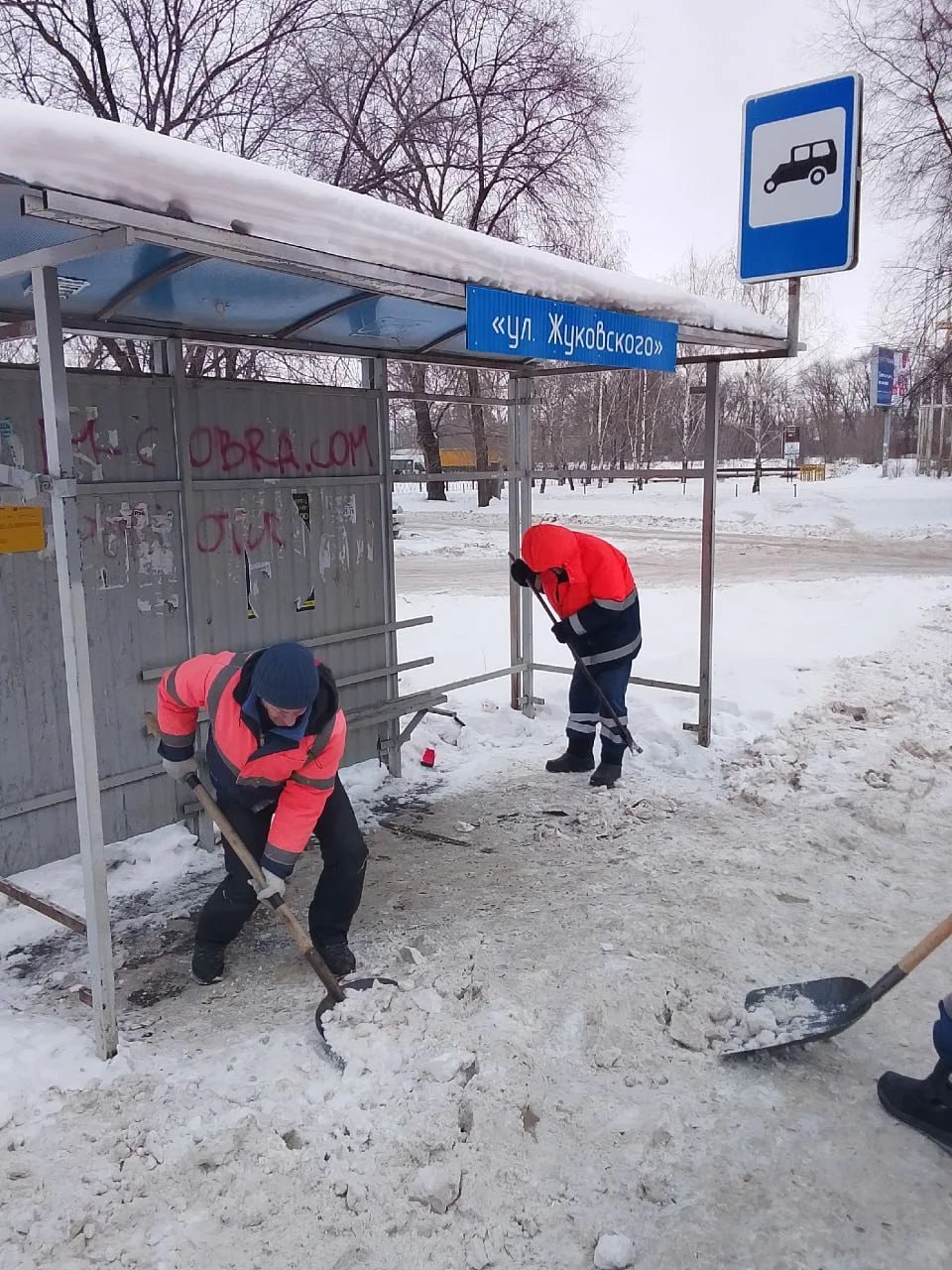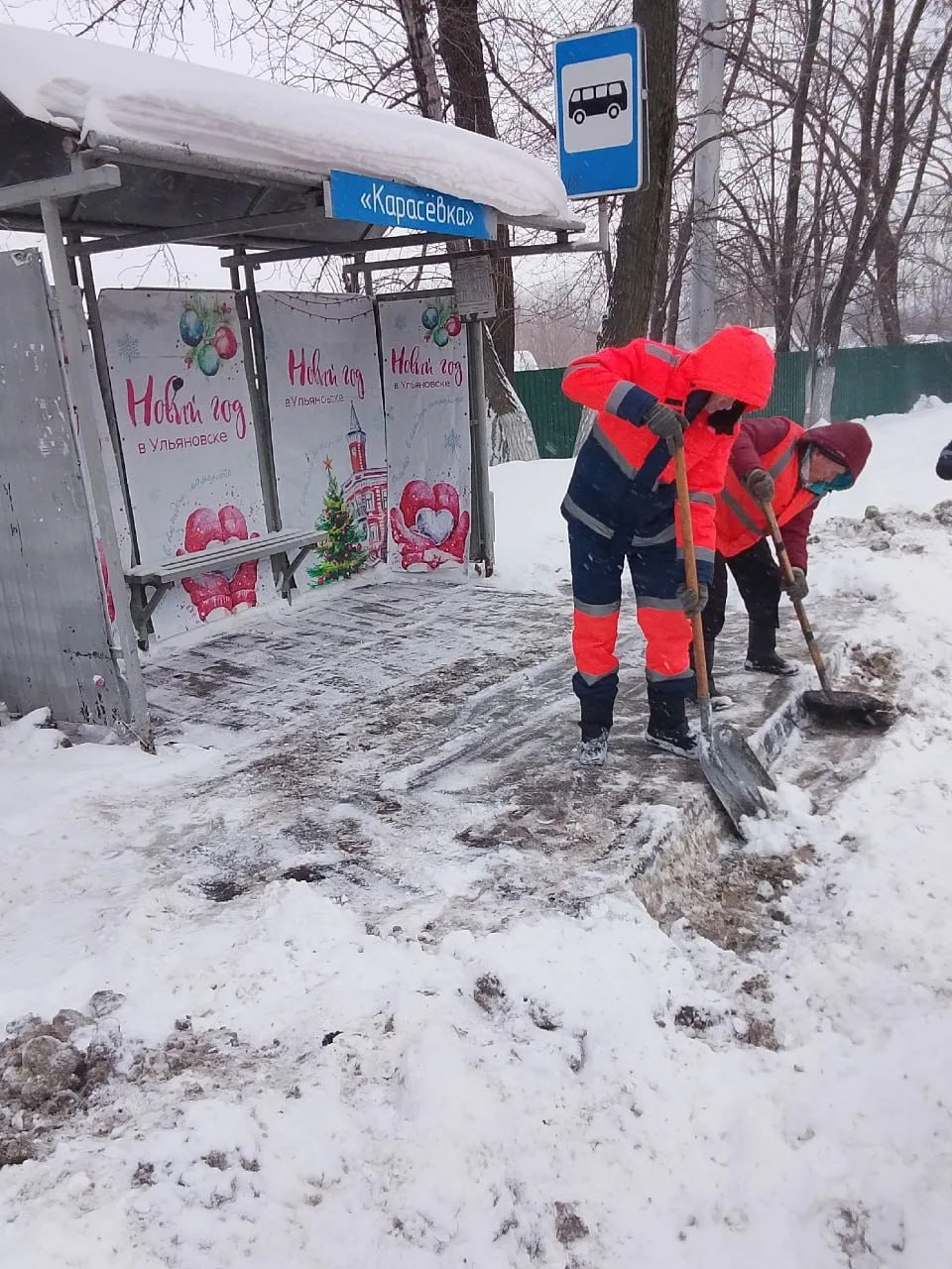 Три бригады из 15 человек МУП Ульяновскэлектротранс очищают стрелки трамвайных путей, ещё 14 дворников чистят остановки общественного транспорта на улицах Радищева, Розы Люксембург, проспекте Нариманова и других участках.