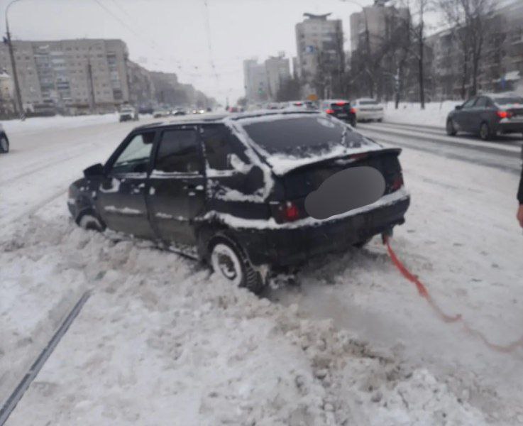 Автомобилист решил свернуть в неположенном месте и застрял на рельсах. Движение по улице Минаева для трамваев оказалось перекрыто