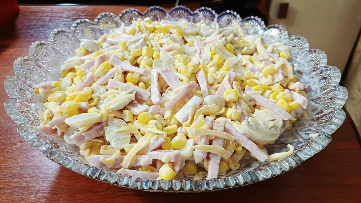 Начать стоит с подготовки ингредиентов: ветчину нарезать соломкой, а сыр натереть на терке. Консервированную кукурузу просто слейте, после чего добавляем её в общую массу. Шампиньоны нарежьте тонкими пластинками и слегка посолите.