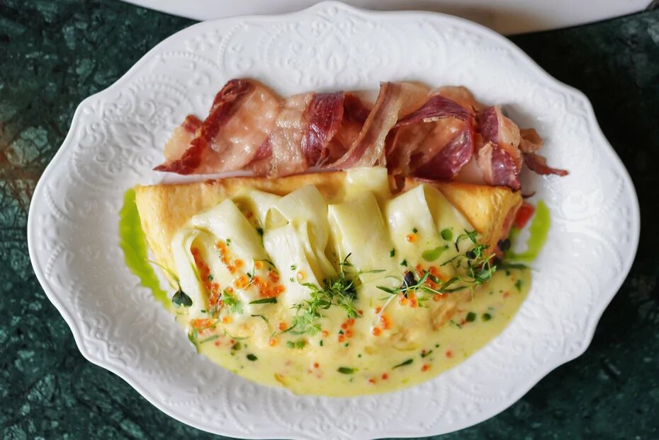 Этот рецепт омлета, вдохновленный утренним волшебством на Патриарших прудах, сочетает в себе не только яйца, но и восхитительный белый соус, в котором гармонично переплетаются сливки и вино. К нему добавляются зеленая спаржа, красная икра и аппетитный говяжий бекон, который подается отдельно, дополняя завтрак сытностью и изяществом. Секретами удивительного блюда поделился шеф-повар ресторана Erwin. Патрики. Павильон. Пруд Евгений Гринчук.