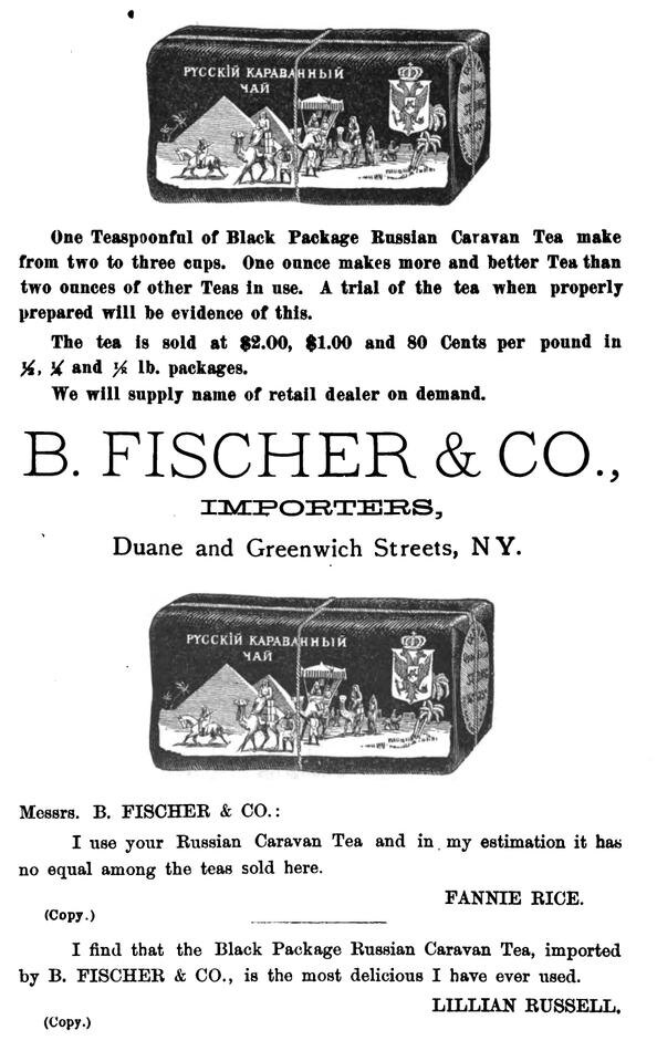 Роман Лошманов выявил самый ранний известный документ с упоминанием Русского каравана рекламу компании B. Fischer & Co., датированную 1889 годом, опубликованную в американской прессе. Эта дата может стать отправной точкой для изучения истории не слишком известного, но весьма привлекательного чая.