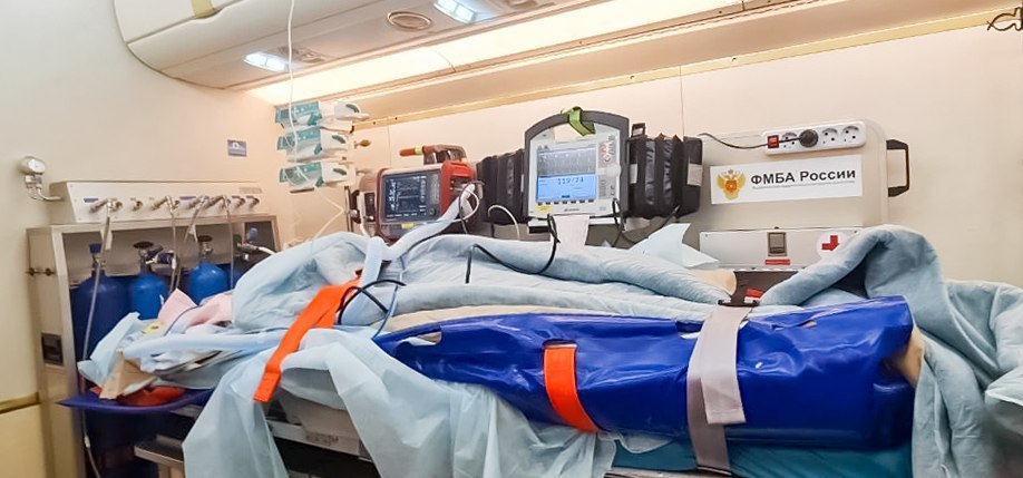 Чтобы обеспечить стабильное состояние врачиреаниматологи, анестезиологи, фельдшеры и медсёстры вели непрерывный мониторинг жизненно важных функций и оперативно корректировали терапию, используя современное реанимационное оборудование, которым оснащен борт санитарной авиации ФМБА России.