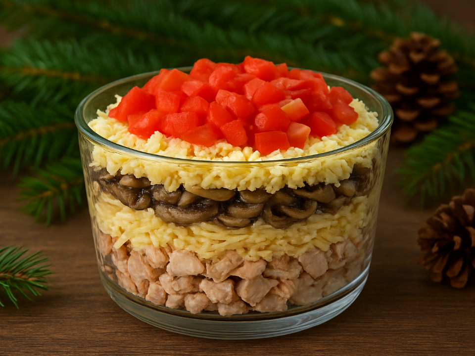 После сборки салат накрывают пленкой и ставят в холодильник минимум на 1-2 часа. Это позволит всем слоям хорошо пропитаться и соединиться. Подают салат охлажденным, он выглядит очень эффектно благодаря контрастных цветов и слоев. Дымный аромат курицы, сочность грибов, нежность яиц и свежесть помидоров делают его стильным украшением любого стола.