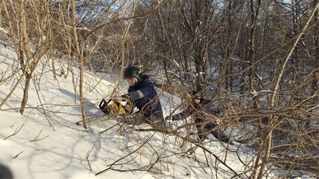 3 и 4 февраля они убрали ещё 22 сорных американских клёна и карагача, а также 100 квадратных метров поросли. От использования автокрана для подъёма порубочных остатков в период крайне низких температур решено отказаться, чтобы не вывести из строя гидравлические механизмы. Это будет сделано позже, во время потепления.
