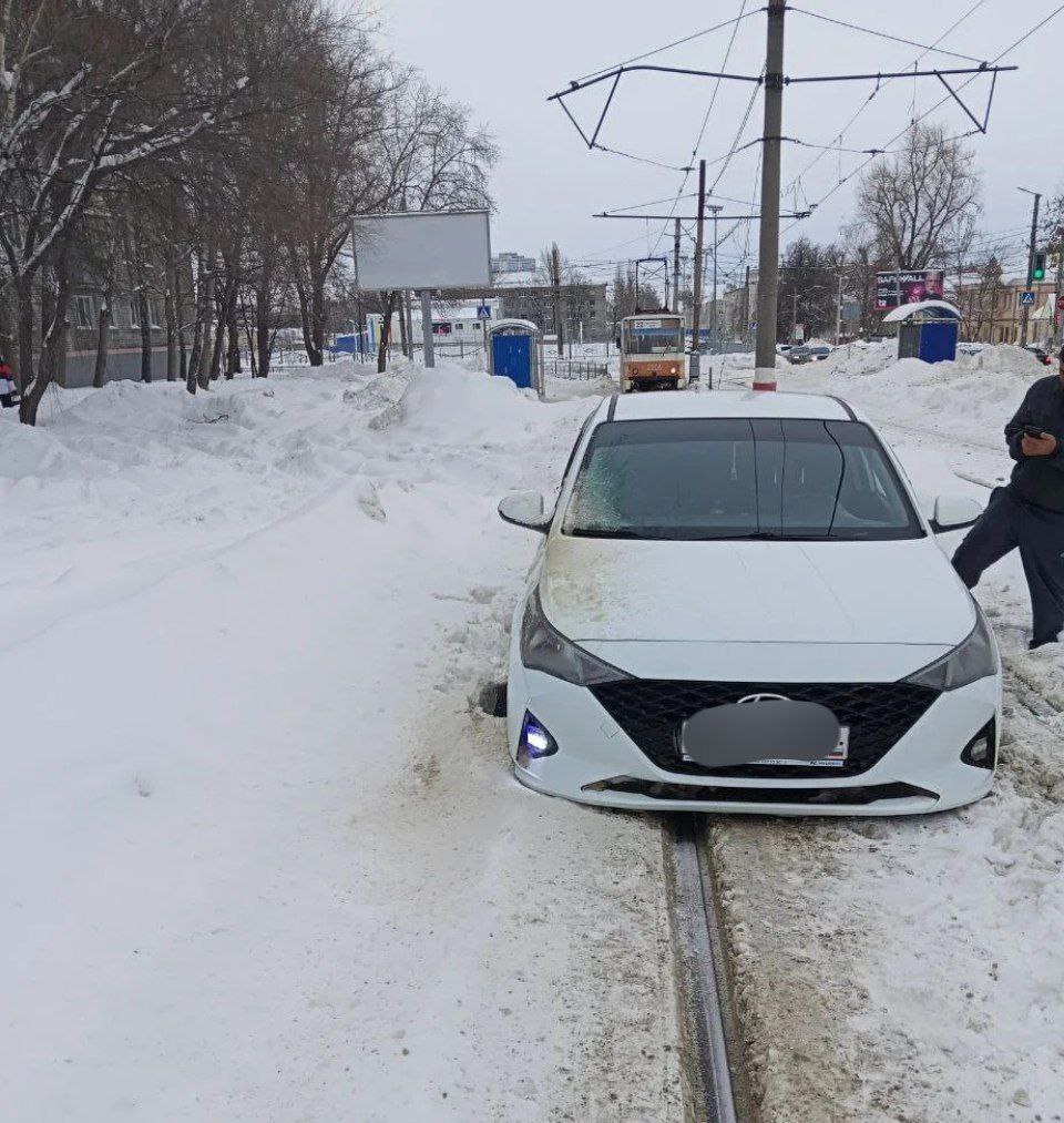 Автомобилист решил, что его машина — вездеход. И застрял на выделенных путях. Движение закрыто.