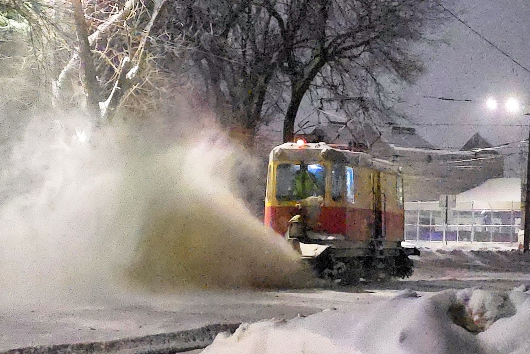 Присоединились к общегородской борьбе с очередным снегопадом на трамвайных снегочистах