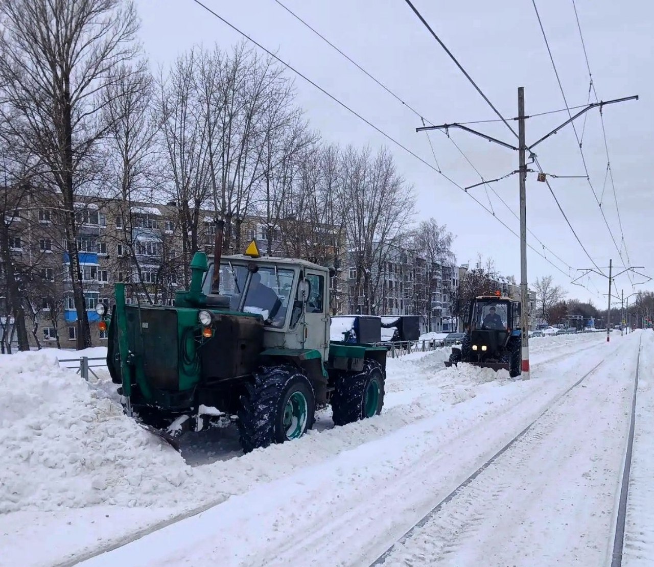 На выходных снова выпало много снега. Ночью пути пробивали трамвайные снегочисты, а с утра к ним присоединились тракторы. Они расширяют колею и убирают спрессованный снег, который может повредить корпуса трамваев.