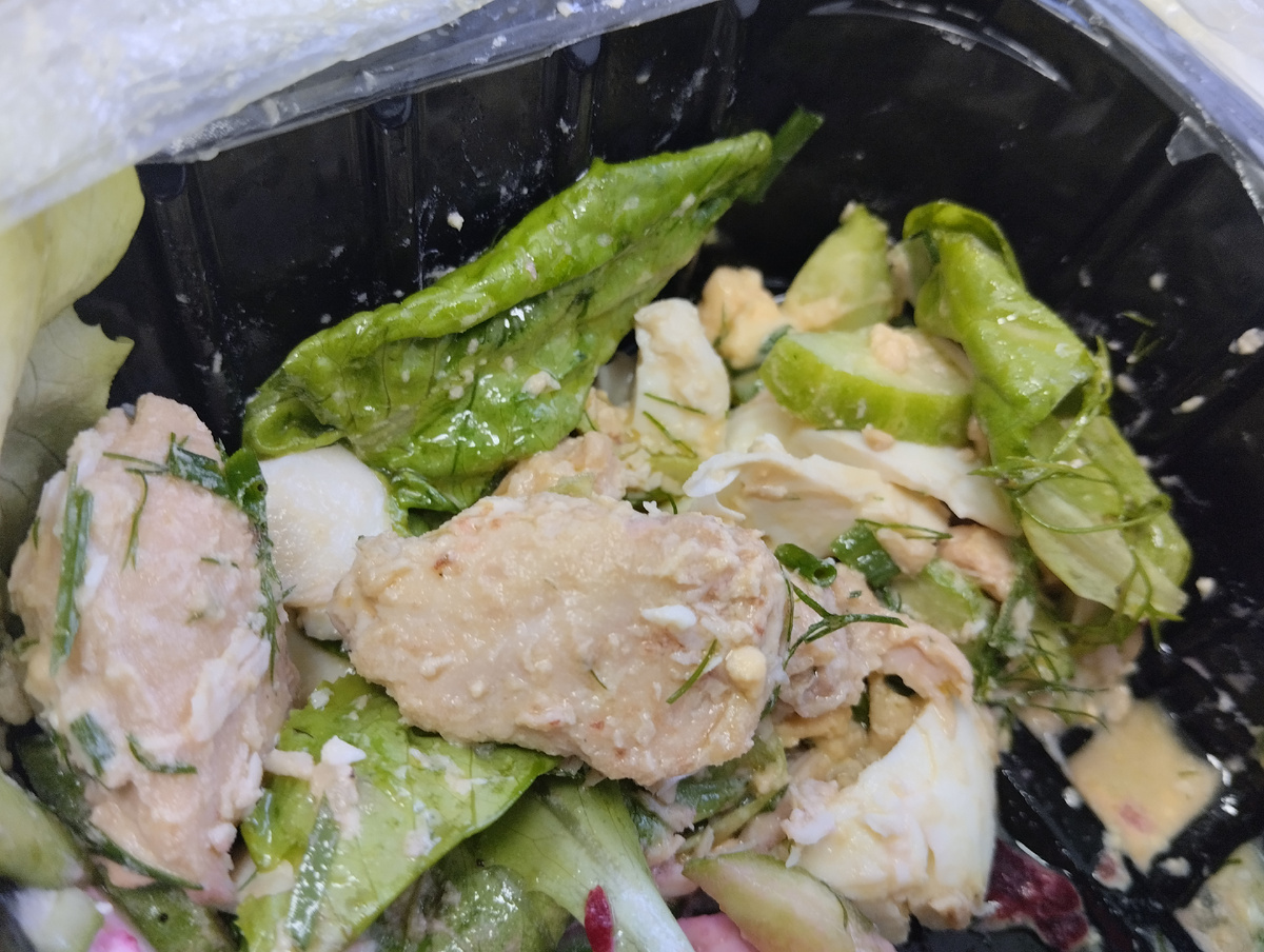 В моём наборе первыми идут свежие листья зелени и огурец, затем — запечённая курица и яйцо, чтобы источник белка держался долго. Немного рыжикового масла и соевого соуса добавляют глубину вкусу, можно заменить и соком лимона. Всё это укладываю в контейнер и держу рядом с рабочим столом.