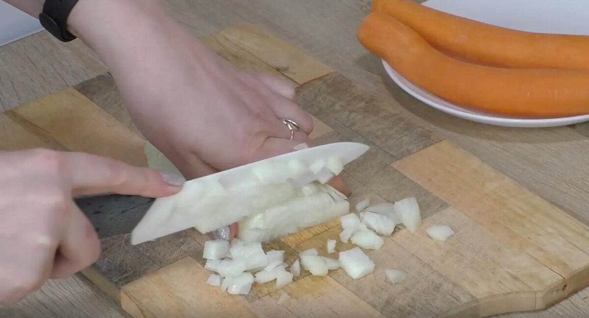 Разогрейте сковороду с растительным маслом. Сначала обжарьте лук до прозрачности, затем добавьте морковь. Жарьте овощи до мягкости, около 3-5 минут.