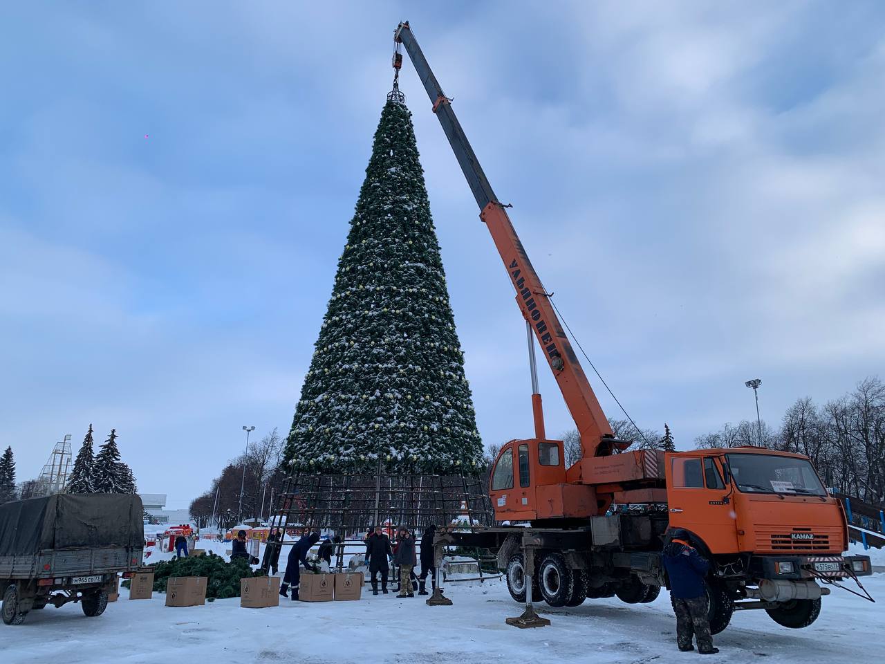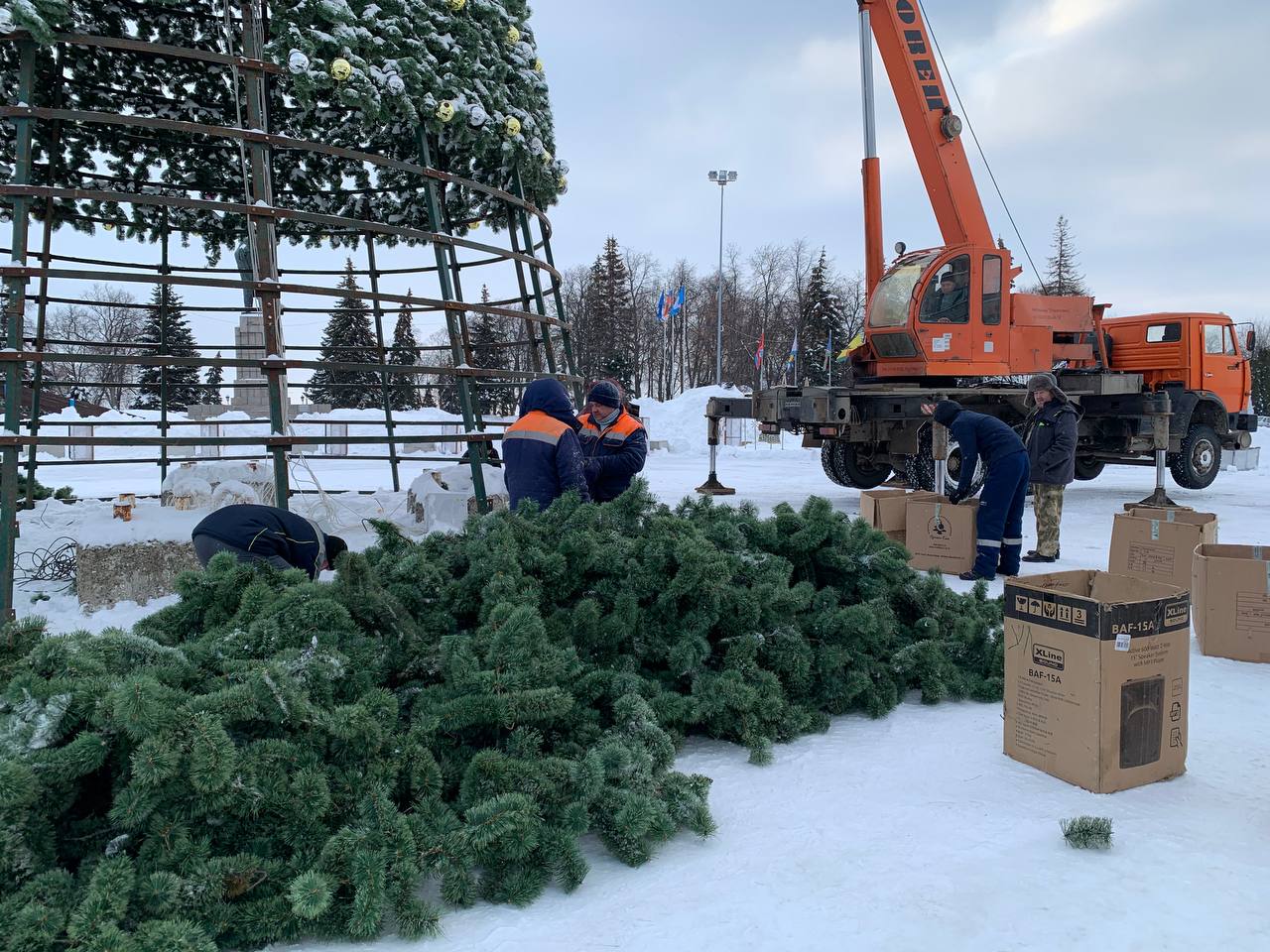 При помощи автокрана они демонтировали металлическую конструкцию и декоративные еловые ветки.