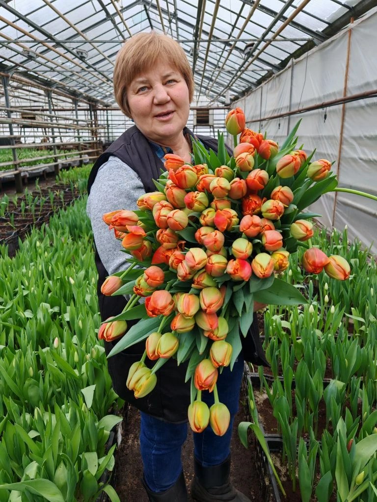 Начальник нашего отдела цветоводства Ольга Ивановна Семагина и её коллеги вырастили для наших фирменных магазинов более трех тысяч тюльпанов желтых, розовых, сиреневых и красно-оранжевых расцветок.
